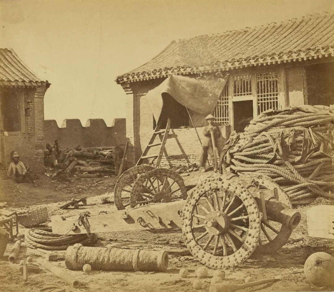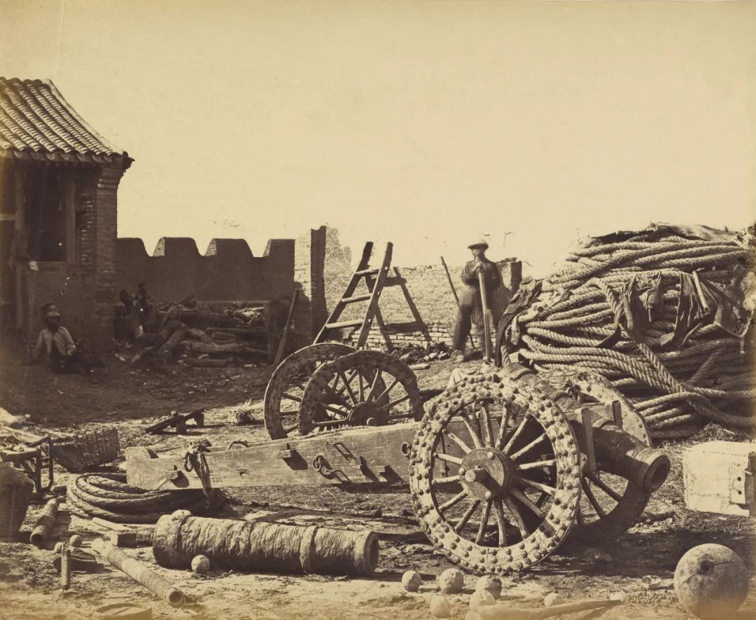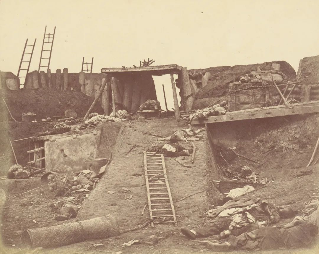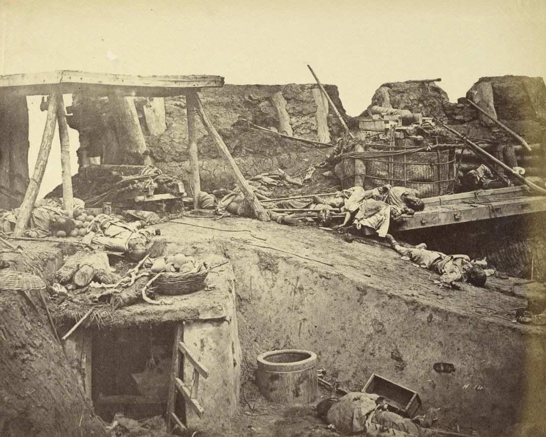 比托在中国拍摄到许多具有历史价值的摄影作品。从他当年拍摄的照片中,我们看到被攻陷的大沽口炮台上趴着阵亡的中国士兵,旁边摆着他们使用的原始土炮和弓弩。清朝士兵尸首遍地的场景也充分表明了英法联军的野蛮屠城。北塘要塞,那是1860年8月英国军队从中国人手中夺得的。此时,英国军队将北塘要塞建成了他们的司令部。而要塞的废墟上,一门被摧毁的大炮仿佛诉说着不久前在此发生的激战。这门大炮原先是安放在木质炮架上的。照片上的英军士兵正在这个刚占领不久的阵地上休息。