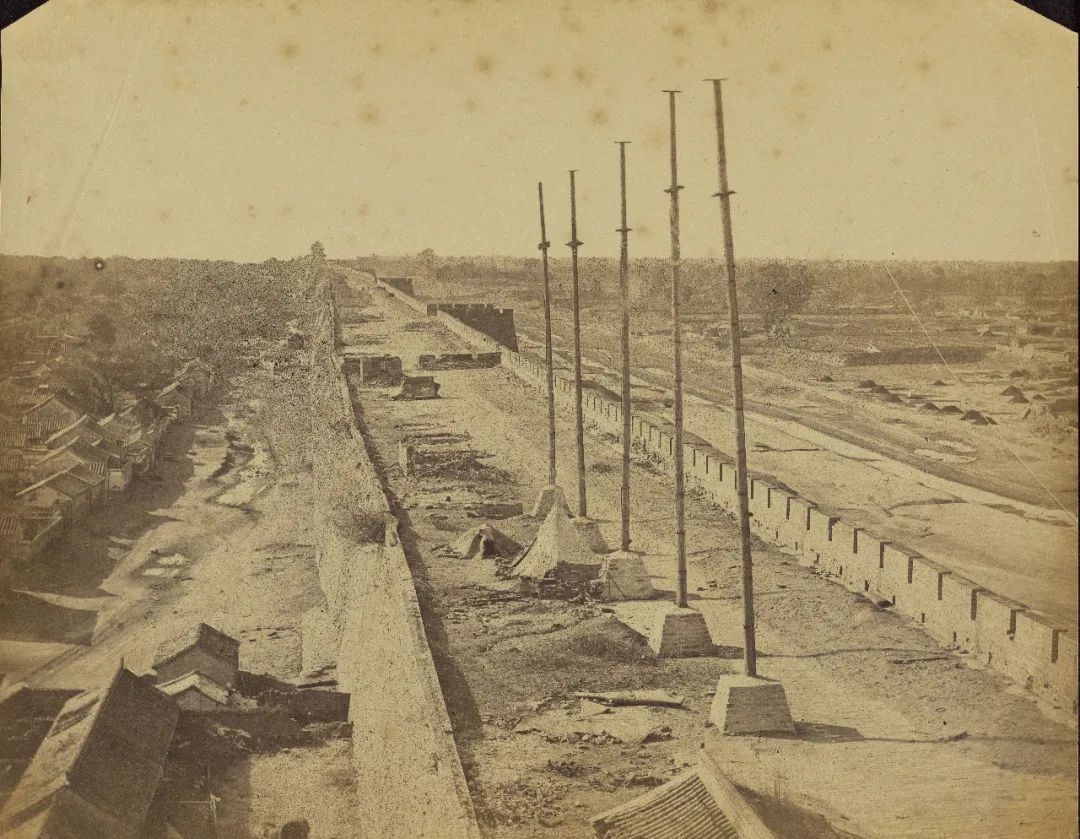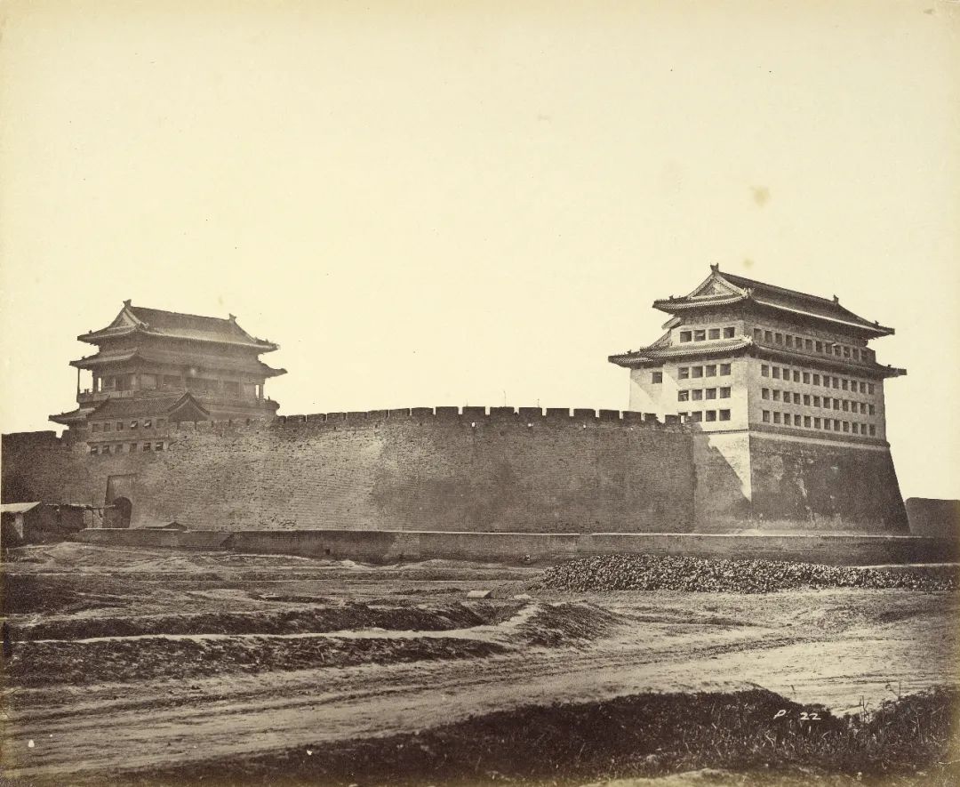 当英军占领安定门城楼之后,比托登上了城楼。他看到:清晰而厚实的城墙笔直地向前延伸,近处有五根高大的旗杆,旗杆下有零星的帐篷,那是驻扎在城墙上,试图建立临时炮台的英国皇家工兵。远处可见德胜门及其瓮城。而从城楼往东瞭望,可以看到清军的大炮和沮丧的清兵,不远处便是雍和宫雄伟的建筑群。从比托拍摄的照片看,城墙顶上确实十分宽阔,并且坚固,只可惜在清政府的腐朽统治下, 这么坚固的城墙仍不能抵挡英法联军的野蛮侵略。