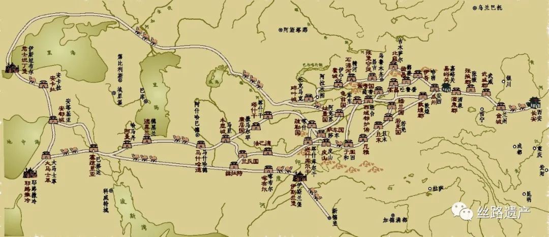 自汉代张骞“凿空”西域,开辟了陆上丝绸之路以来,我国古代对外经济文化交流活动长期主要由这条陆上丝路加以沟通。这条陆上丝路西出玉门关(在今甘肃敦煌西北方盘城)或阳关(在今甘肃敦煌西南古铜滩附近),越过茫茫的白龙堆大沙漠,沿天山南北麓或昆仑山北麓,翻过葱岭,经中亚各国,前往西亚南亚地区。以后又经东汉班固“定西域”,确保了它的畅通无阻。在两汉时通过这条商路,与西方的丝绸贸易异常频繁,促进了东西方的经济文化交流。当罗马恺撒大帝穿上中国的丝袍去看戏时,显得尤为华贵,引起了全场轰动;罗马的贵族妇人都以能穿上中国丝绸衣裙为荣,中国的丝绸轰动了西方,成为罗马帝国最受欢迎的奢侈品。魏晋南北朝时期,西域各国与中原地区的割据政权的联系基本中断了。直到隋唐统一中国以后,与西域各国的关系才又得到恢复和发展,使这条陆上丝路重放异彩,再度辉煌。
