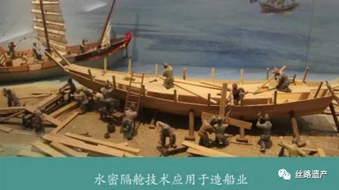 再从唐代造船业的发达来看,自隋炀帝开通南北大运河以后,隋唐时期水上运输十分发达,造船技术也有了很大提高。据《资治通鉴》记载,唐代主要造船基地有:宣州(今安徽宣城县)、润州(今江苏镇江市)、常州(今江苏常州市)、苏州(今江苏苏州市)、湖州(今浙江湖州市)、杭州(今浙江杭州市)、越州(今浙江绍兴市)、台州(今浙江临海县)、婺州(今浙江金华市)、江州(今江西九江市)、洪州(今江西南昌市)等州及剑南道(今四川成都市)沿江一带;以及沿海的登州(今山东蓬莱市)、莱州(今山东掖县)、扬州、福州、泉州、广州、交州等。不难看出,全国造船基地基本上都在东南沿海地区。在造船技术方面,隋代杨素在永安(今重庆市奉节县)造“五牙”战舰,船上起楼五层,高百余尺,可载战士八百人。唐代造船技术已居世界领先地位,已能造出当时世界上最大的海船。隋唐造船业已广泛采用钉榫接合技术,并建有多道水密隔舱,不仅能抗风浪,而且可以抗水沉,保障远洋航行的安全。当时的阿拉伯商人来华,都愿乘中国船,如一时中国船未到,他们也愿耐心等待。唐代东南地区造船业发达及先进的造船技术水平,为海上丝路的发展创造了有利条件。