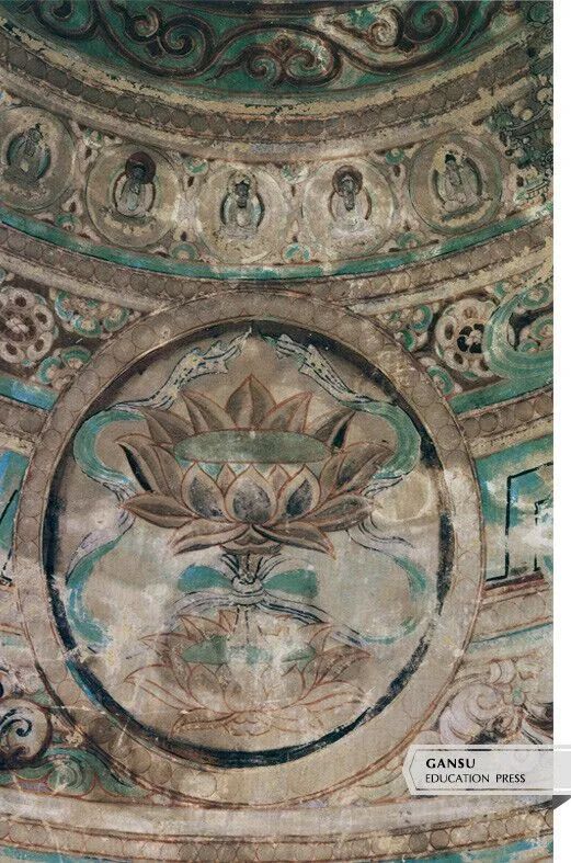 无论是雕塑造型,绘画纹饰,莲花都是敦煌佛教装饰纹样中的重要题材。我国春秋、战国时代的诗歌里就有吟咏莲花的篇什,在铜器铸造上就有莲花的造型,可见在中华民族审美的传统中,莲花早就是各阶层人民喜爱的花卉之一。佛教从天竺传至西域,再入中土,莲花就成为佛教的象征;加以大乘净土宗的流行,《妙法莲花经》的传播更增加了莲花的神圣性。在敦煌莫高窟,从北凉到元朝,窟窟都有莲花,莲花成为装饰石窟的主要纹样素材。研究莲花的样式,已成为判断敦煌艺术时代的重要依据之一。