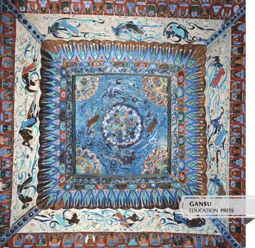 敦煌壁画中的藻井是敦煌图案中的精华。由于它高踞石窟顶部,受风沙日晒的剥蚀较少,也免除了许多人为的破坏与盗劫,故多保存完好,色彩、纹样较为完整。从北凉时代起,敦煌石窟藻井图案就变化多端,从四方交错套叠的斗四形,到中心方井四披幔帏的华盖形,经历一千余年的不断创新,在局促有限的窟顶壁面上,显露出画工们无穷的智慧。藻井四披是由简到繁的帏幔,从线描组合上可以看出各尽创意、各具匠心,为我们民族图案的构成留下了重要的参考。