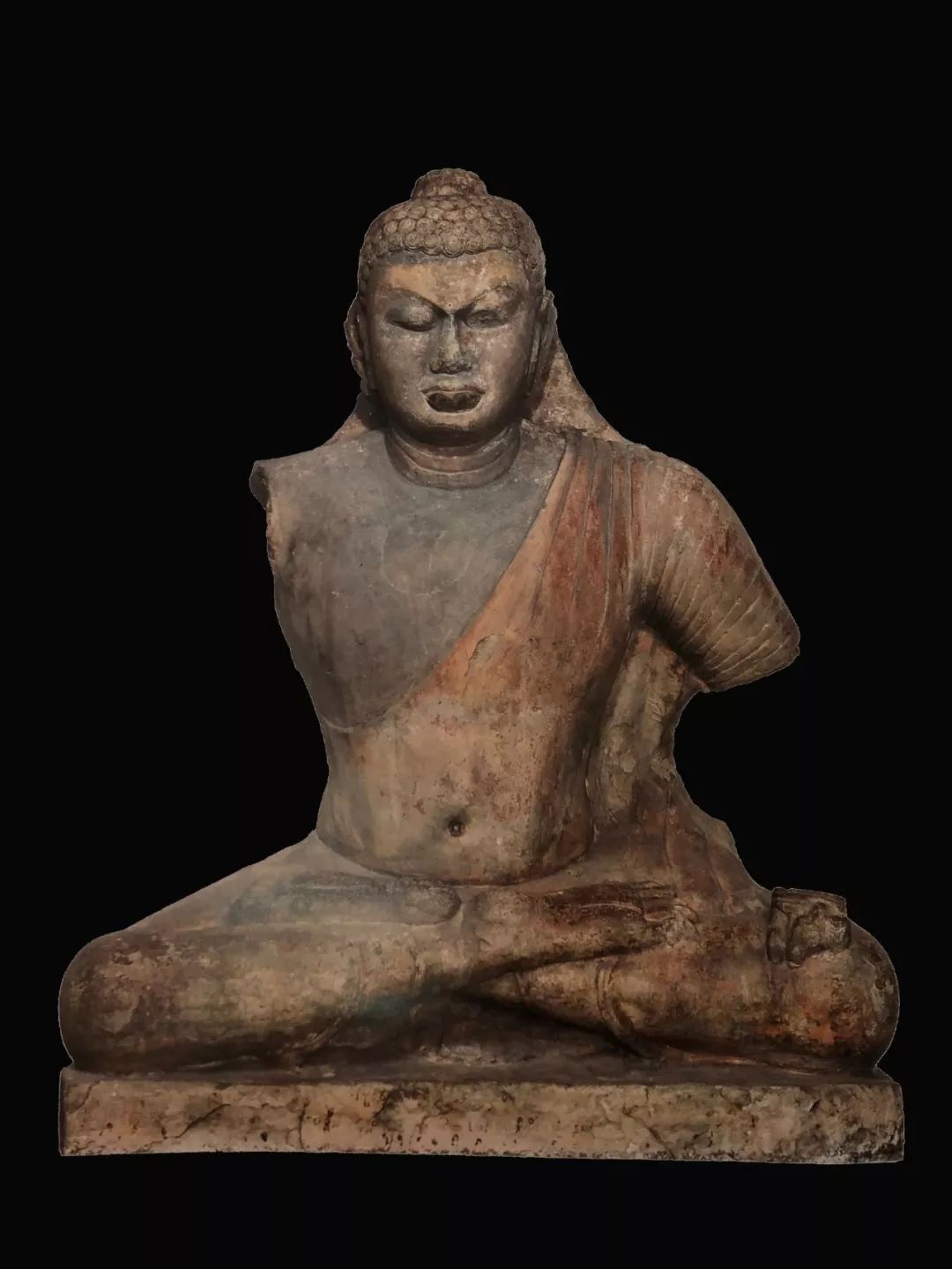 ▲造像身着犍陀罗式通肩佛衣,右手施无畏印,左手所持法物亦非常见的持净瓶或结手印的样子。整体风格受到了印度犍陀罗艺术的影响,同时又融入了中土审美情趣和表现手法。据此推断,造像时代应为西晋十六国。