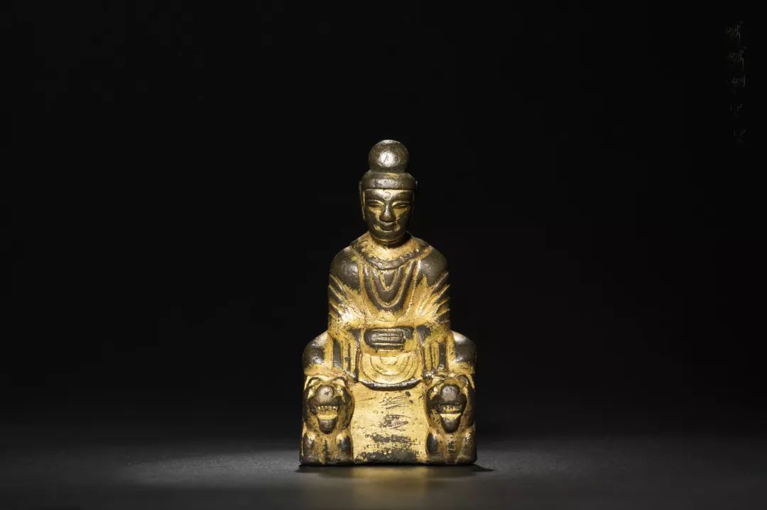 ▲坐像通体鎏金,佛祖面容端庄,俯视前方,双手于小腹前结禅定印。台座前两只护法狮子张口昂头,牙齿清晰可见,为五胡十六国时期坐像中的上乘之作。