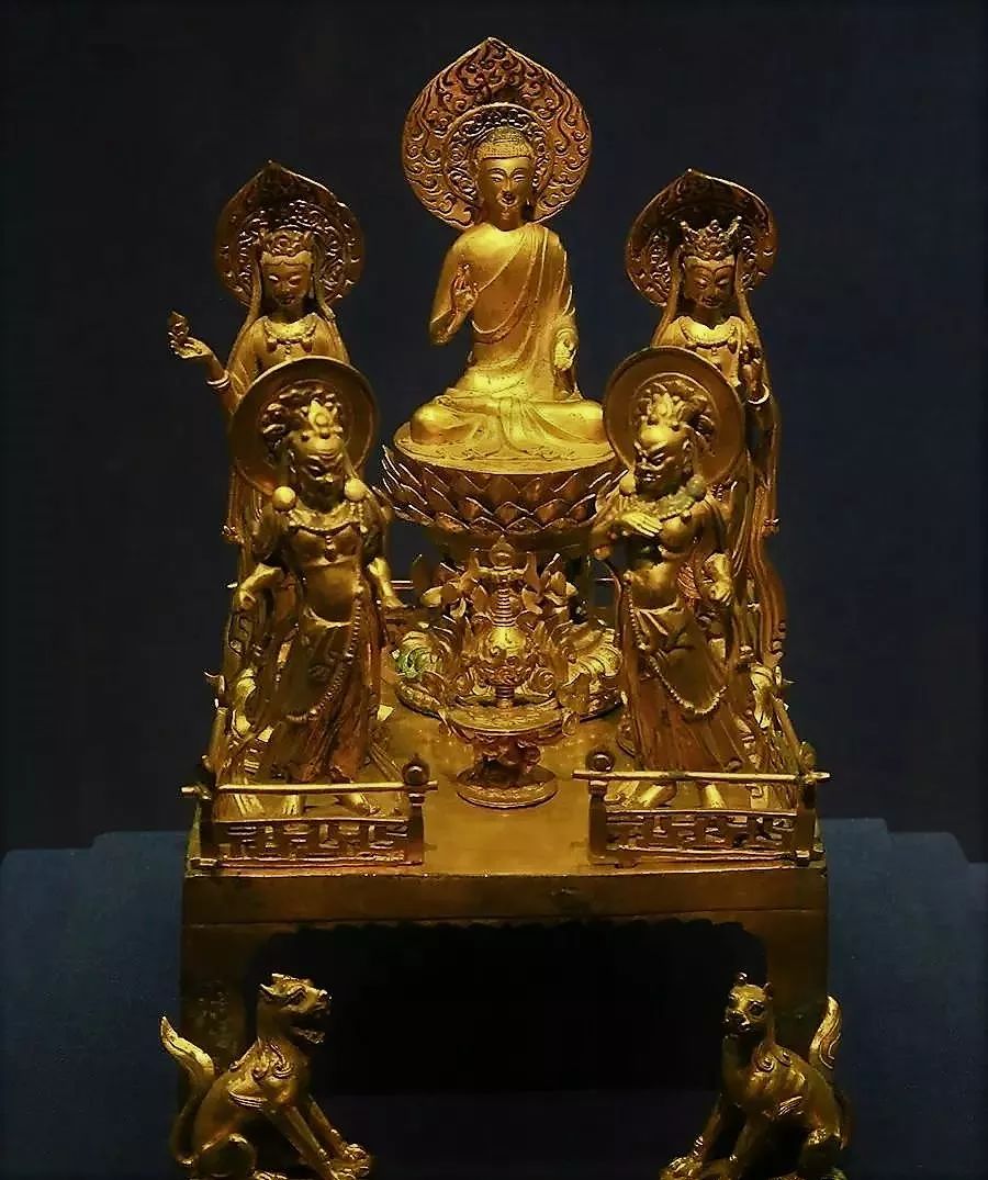 这铺铜鎏金造像为一佛二菩萨二力士的人物组合,加上台座和狮子,保存完好,鎏金精美。台座后侧所刻发愿文称:“开皇四年七月十五日,宁远将军、武强县丞董钦敬造弥陀像一区……”,可知这是公元584年所造的一铺阿弥陀像。主尊肉髻低平,脸型偏圆,眉毛以阴线刻出,双目细长,嘴角上翘,面带微笑。身着袒右肩袈裟,左手向前平伸,右手抬起,掌心向外,施无畏印,姿态清秀自然。佛的两侧立胁侍菩萨,体型细瘦,宝珠形头光,头戴宝冠,缯带从宝冠左右垂至膝侧,下着裙,披挂璎珞等饰物,帔帛搭于两臂,垂于体侧,跣足立于莲花座上。左侧菩萨右臂自然下垂,平托一莲蕾,左臂上举,捏宝珠。右侧胁侍菩萨右手举与肩平,持莲蕾,左手置于胸前,手心朝下。两菩萨的前面是二力士,稍稍侧身握拳,竖眉鼓目,嗔目怒视,衣裙随着人物的姿态动作飘向一侧,与相对静止的佛与菩萨形成对比,渲染出一触即发的力量感。两力士中间为地神托举博山炉,地神一手撑地,另一手与歪向一侧的头部承托底盘,圆形平托上有莲花与莲叶簇拥的博山炉。带有护栏的台座四边开壸门,前面两侧有相向蹲立的狮子,昂首挺胸,前腿伸直,筋肉鼓起,充满着紧张感,似乎随时都会一跃而起。这铺铜鎏金造像保存完整,造型和做工均十分考究,是隋代金铜造像中的精品。