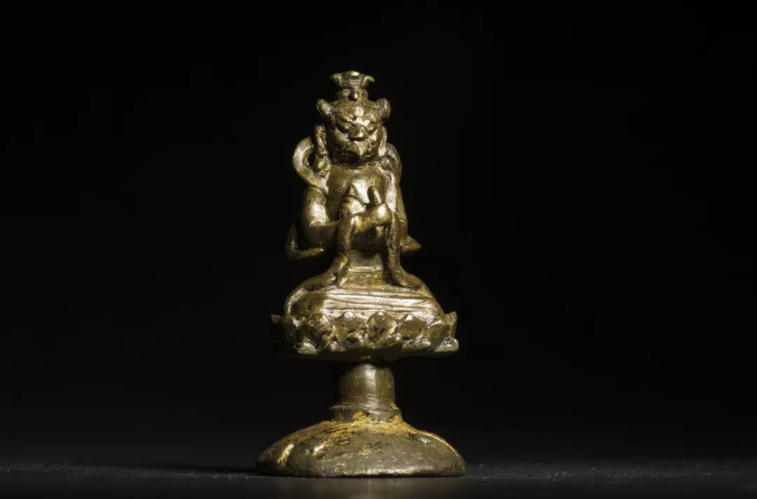 ▲造像通体鎏金,跏趺于束腰式莲台上,面呈雷公之状,眉眼、鼻嘴如鹰,眼光俯视,凶悍无比。护法裸上身,显露钢筋铁骨般身躯,霸气十足,下身穿羊皮短裙紧裹躯体,身体笔挺,气势逼人。