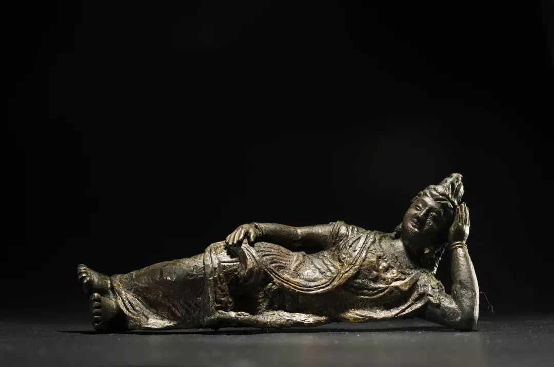▲菩萨呈侧卧姿式,极为少见。头束高发髻,面相饱满清晰,秀目微闭俯视人间冷暖。身躯呈现S型,丰腴,华贵。跣足而卧,脚部轮廓清晰,姿态万千,威仪而祥和。形式服务于内容,佛教传布过程中教义的变化直接导致造像的改变。由于重文,宋代的文化前所未有的昌盛,佛教完全被改造成“披着袈裟的老庄”,其造像也与古印度的梵相大相径庭,从内容到形式都呈现出中国面貌,变化最大的莫过于布袋和尚(弥勒)、泗洲大圣(观音)、女相观音、罗汉等,这些形象与现实中的真人并无二样,但道行极高,神通广大,救苦救难,深受百姓的膜拜。