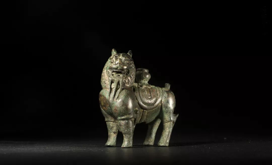 ▲雄狮青铜铸造,扭腰甩头,张口獠牙,目瞪前方,两耳竖起,胸口宽厚肌肉凸起,身披锦鞍驮宝瓶,四蹄蹬地威猛雄劲,势不可挡。狮子非中国本土所产,西汉时已入贡。唐太宗贞观九年,康居国进贡狮子,唐太宗命浙东籍宠臣虞世南作《狮子赋》。这时各国已大量进贡,唐朝也是塑造狮子最辉煌的时代。