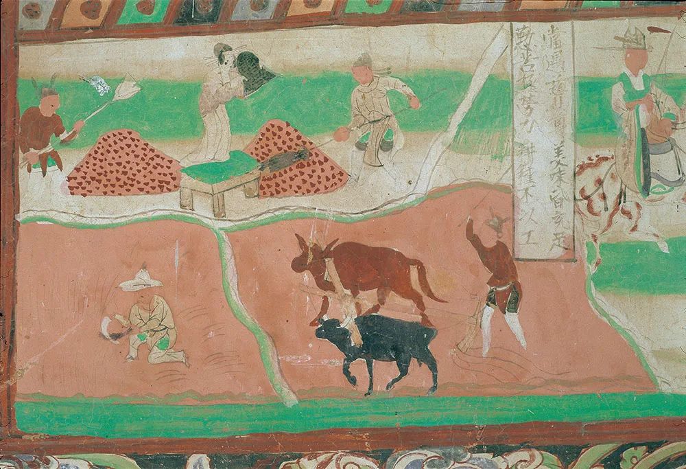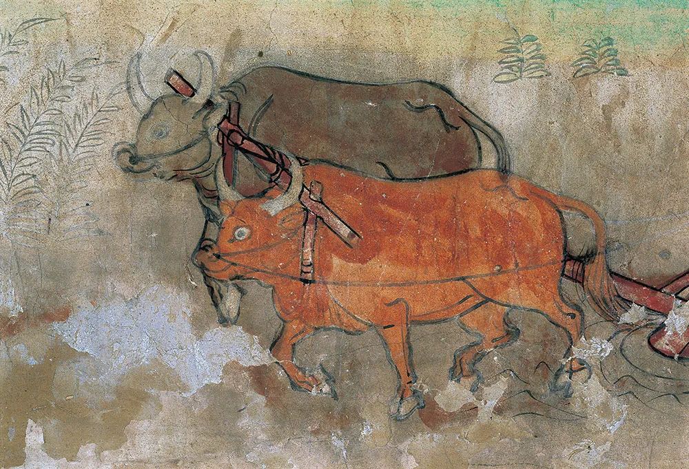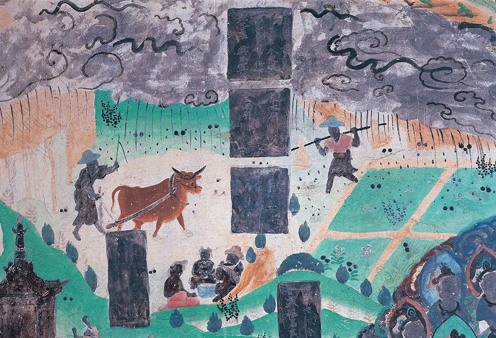 在敦煌壁画中,保留着许多农作画面,耕牛的身影更是频频出现。无论是乌云密布、闪电倏忽的日子,还是日高曝晒、异常炎热的时间,在农夫挥鞭犁地时,耕牛都是独一无二的农活好帮手。