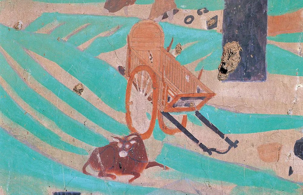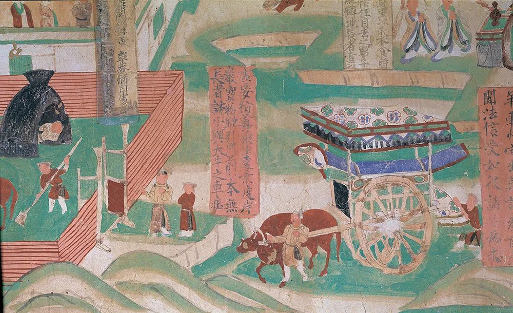 后来,人们追求出行的舒适体验,由于牛车行驶平稳,车厢较大且有遮挡,可以自由坐卧,极大地增强了人们乘车的愉悦感。因而从东汉末年起,牛车逐渐成为人们出行的主要代步工具。在莫高窟第61窟里就有这样一辆豪华通辀牛车,车顶上罩一张大帷幔,车舆描绘细腻,装饰富丽堂皇,为研究古代车辆构造装饰提供了珍贵的形象资料。