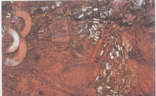 在出土大量青铜器等文物后,1号墓主的遗骸终现端倪。从骨骼上判断,这是一位女性,她仰身平躺,嘴中含玉,可能是下葬后棺内进水,墓主陪葬的一玉饰发生了移位,全都堆到她的下颌底了,而且考古队员凭经验推断,这些玉片原本是项饰和玉组佩。