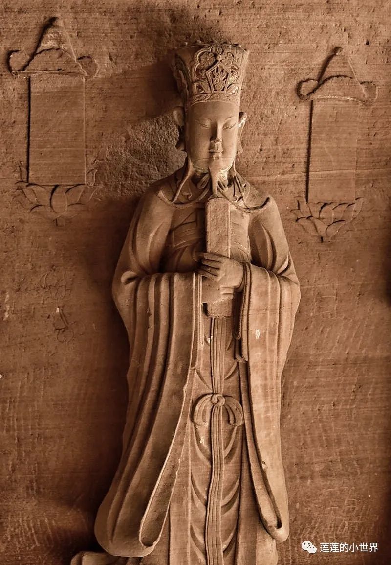 第9龛是诃利帝母像,诃利帝母也被称为鬼子母,她生有500个孩子,本是一盗食人间小孩的恶鬼,后被佛祖收服,化身成了民间孕妇和儿童的保护神,俗称“送子娘娘”。此龛中鬼子母呈贵妇像,身着华服,头戴凤冠。手抚一小孩与膝部,形象雍容华贵。曾有历史爱好者结合此龛雕凿时间判断,此像应是宋真宗明肃皇后像——那位名叫刘娥的传奇女性。