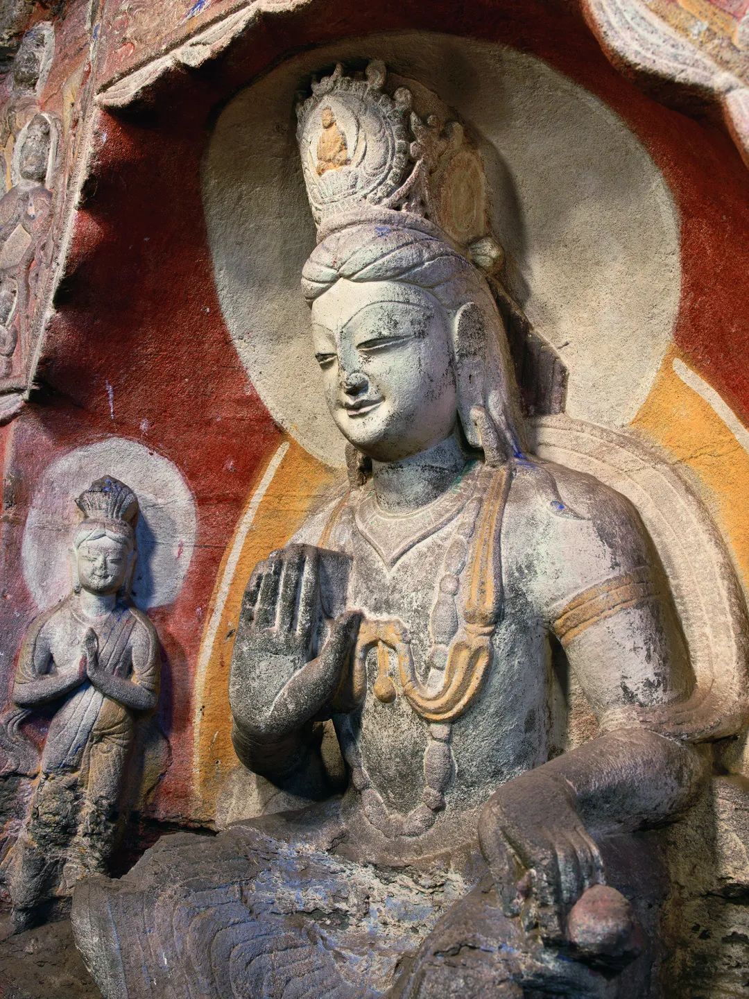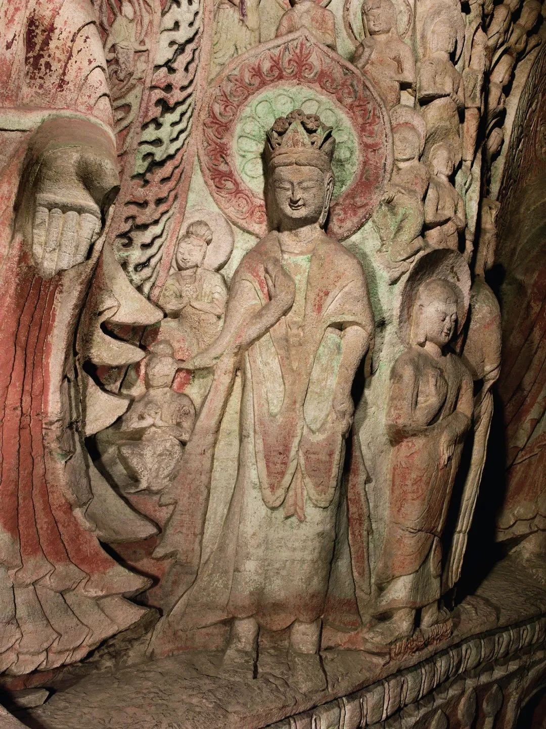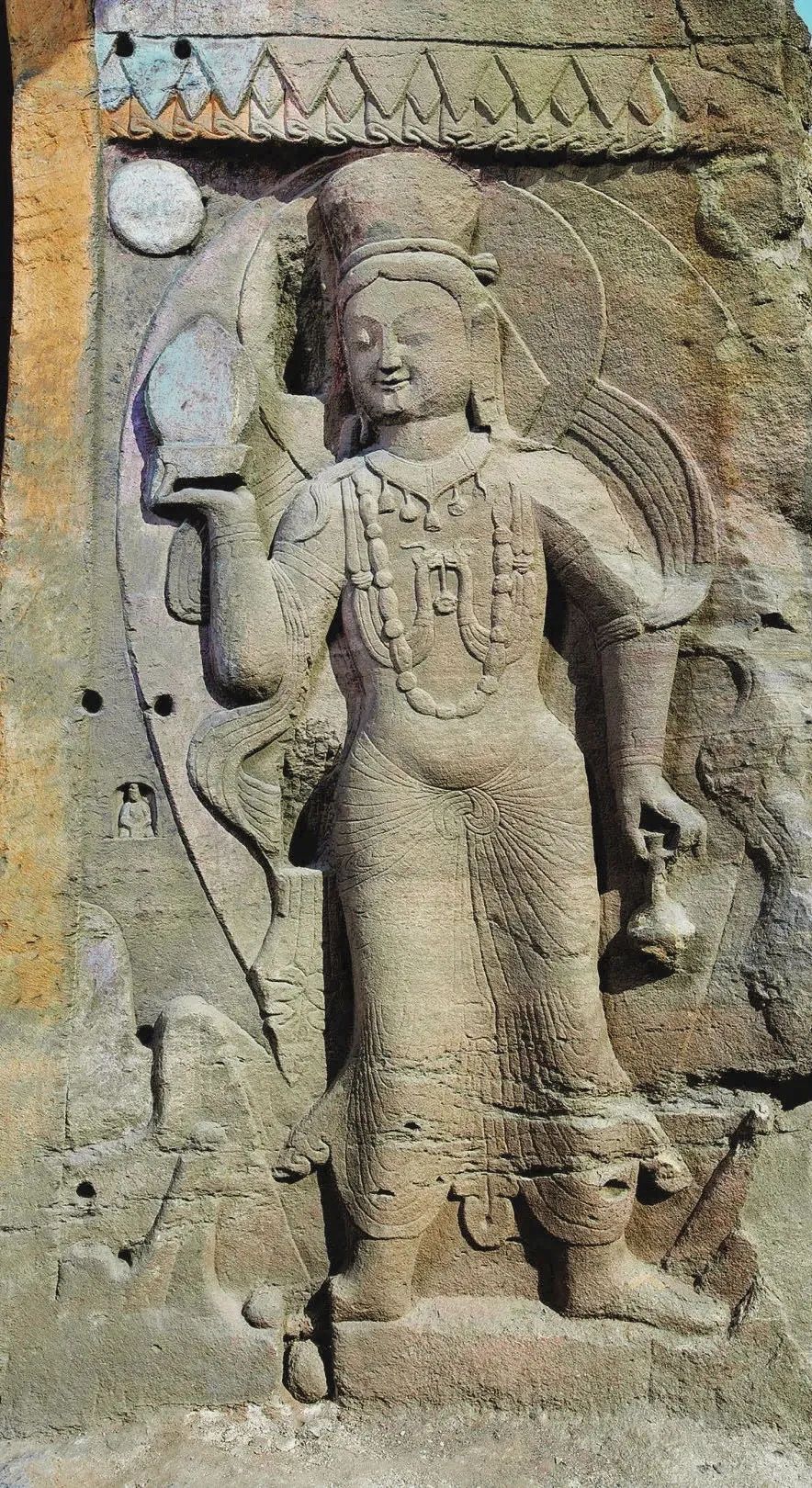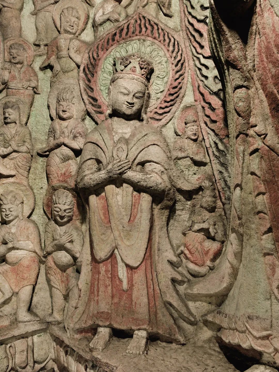 在佛教中,菩萨是被崇拜和歌颂对象,但其地位又不及佛陀,是与世俗社会更加接近的人物。因而,人们在塑造他们时,一方面以接近佛陀的形象进行庄严美化,另一方面,由于其低于佛陀的身份,艺术家不仅可以将不少世俗内容赋予菩萨,还获得了更多的创作自由,使菩萨形象装饰华丽,神采飞扬。