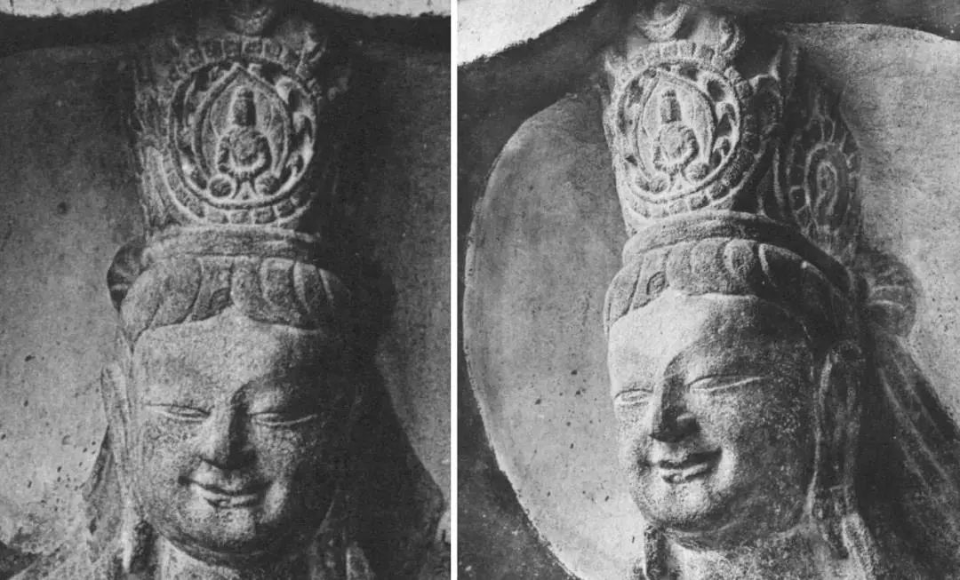 一般讲,宝冠上中央有化佛(坐佛像)的菩萨被视为观音菩萨。但在云冈这种化佛宝冠比比皆是,数量很大,根据佛教经典陈述观音菩萨的种种特点,其中有的的确是观音菩萨(如上述第3窟雕刻的“西方三圣”中宝冠上雕刻了兽头化佛形象的,就是观音菩萨),但多数是不能确认其为观音身份的菩萨,因此,化佛宝冠在云冈又成为一般菩萨造像的特征之一。