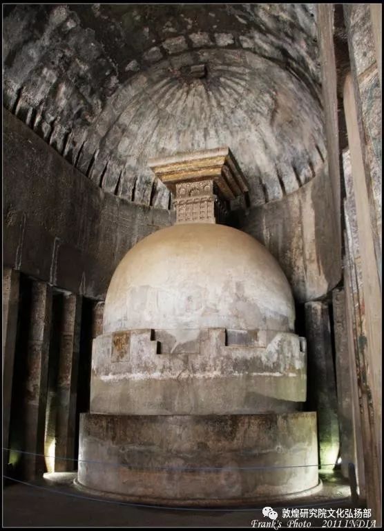 中心塔柱来源于古代印度的“支提”(Chaitya)式石窟,也被称之为塔庙窟或者塔堂窟。在古代印度它的结构形式是在一个纵长方形又类似于马蹄形的石窟空间的后部区域建造一个圆形覆钵式塔,供给信众们礼拜。之后这种塔庙窟逐渐发展成为下部塔台升高,正前面开龛造像,用于信众们礼拜的对象由覆钵塔转为龛内佛像,但塔顶仍然保存最原始的基本结构也就是类似于半个球状的覆钵。