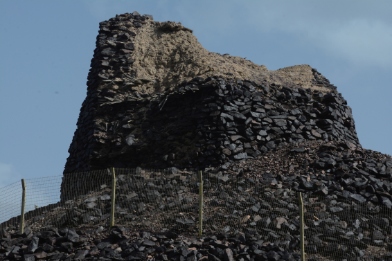 三塘湖石板墩烽燧位于巴里坤三塘湖乡中湖村东南32千米的小山顶上,北约600米处为三塘湖乡至岔哈泉的公路,西北500米处为三塘湖石板墩西草滩,此处原有一眼泉水。烽燧西北距四塘泉烽燧11千米,东南距岔哈泉烽燧19千米。烽燧平面呈八边形,底边边长约3~4、残高约7米。烽燧内外分筑,外用石块垒砌,黄泥坐浆,南面已坍塌,从坍塌处发现烽燧内部系土坯错缝平砌,每隔不等距离都平铺有一层较粗的树枝作为栣木(图一五)。