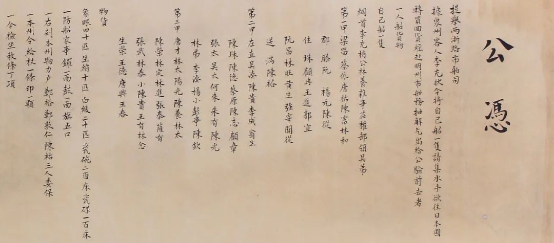 作为海外贸易的管理机构,市舶司还承担着出口贸易的审批管理职能。日本史料《朝野群载》摘录了北宋崇宁四年(1105年)的一张公凭。公凭由当时的明州市舶务出具,船主为泉州商人李充,贸易的目的地是日本。公凭上除了记载船主、船上人员、相关市舶条例之外,还详细记载了此次出口日本的货物,主要分为两大类,一类是丝绸,包括象眼四十匹、生绢十匹、白绫二十匹,另一类是瓷器,包括瓷碗二百床、瓷碟一百床。