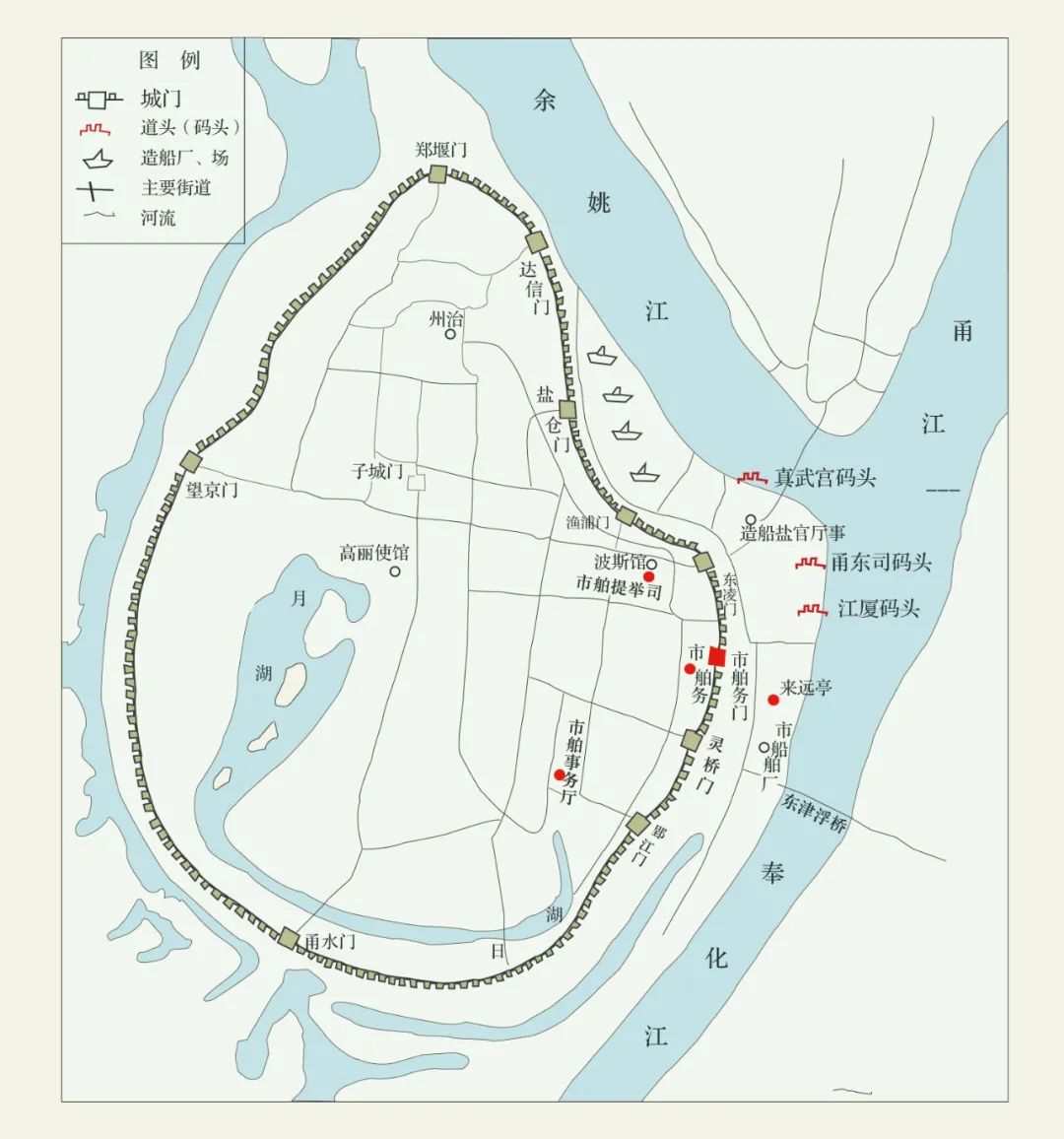 海外贸易的繁荣以及政府对此的重视带来相关管理机构的创设。北宋开宝四年(971年),政府在广州设立市舶司以管理海外贸易,这是中国历史上首次设立海外贸易的专门机构。到了宋真宗咸平二年(999年),经过几次反复,明州市舶司最终设立,管理明州港进出的海外贸易。明州的市舶司最初设在定海县,不久移到了三江口的州城之内,同时还专门设置了用于海外贸易货物进出的市舶务门。南宋宝庆三年(1227年),当时知庆元府(南宋以来明州改称庆元)的胡榘重修州城,因为城门外有当时的通判修建的来安亭,胡榘题匾将城门改称来安门,“惟舶货入则开”。