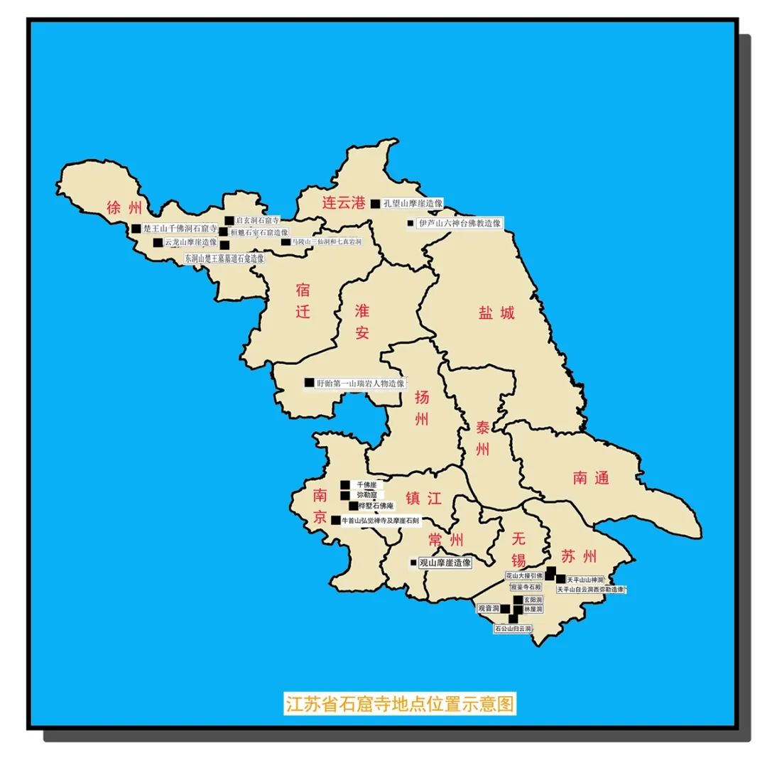 截至2021年2月8日,江苏省石窟寺专项调查的野外工作基本结束,仅1处地点因疫情影响,暂时未能完成息采集。本次专项调查成绩显著,共确认石窟寺(含摩崖造像)地点22处,包含徐州6处、连云港2处、淮安1处、常州1处、苏州8处以及南京4处,其中新发现地点多达11处,占全部地点的50%,新发现地点又以苏州地区为最多。全省石窟寺资源整体上呈现地点较少、分布集中和年代较早、风格多样的特色面貌,年代上启东汉,下至明清,集中分布于连云港、徐州、南京和苏州等地区。