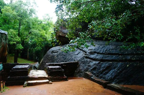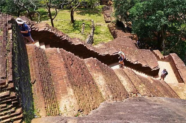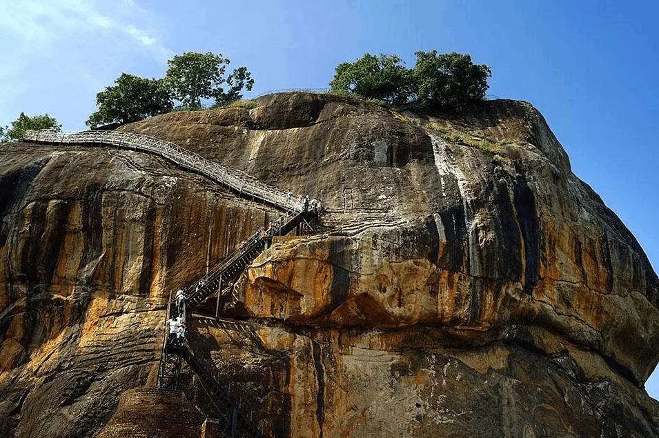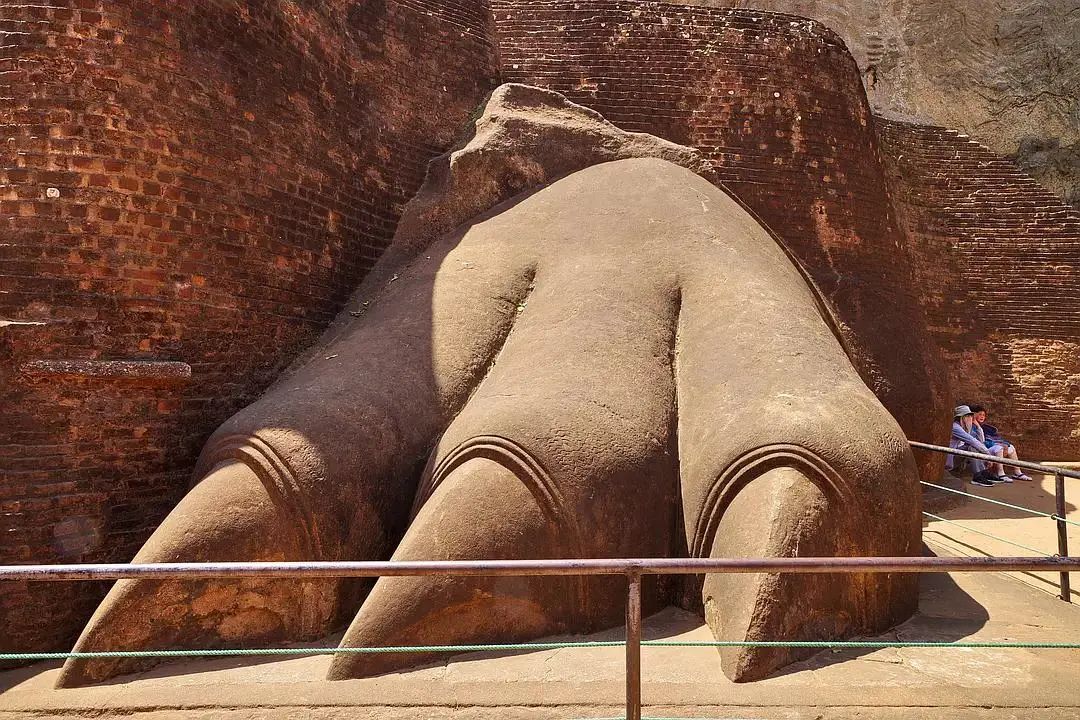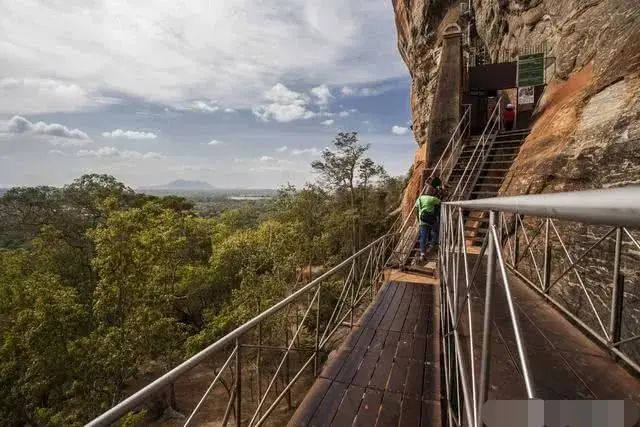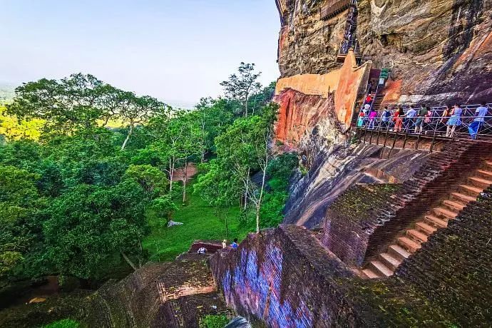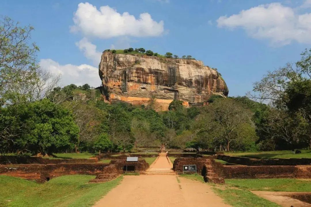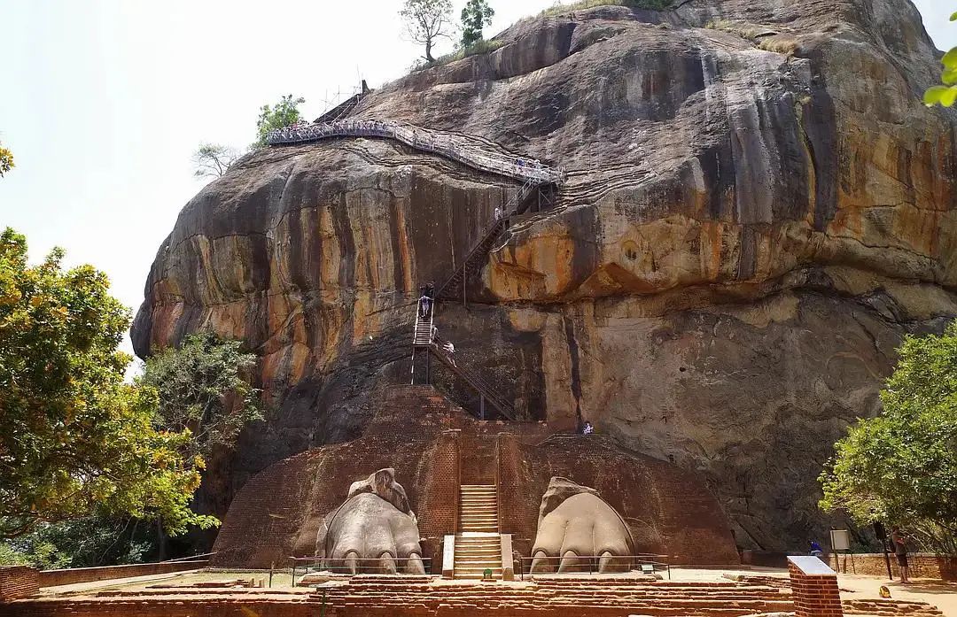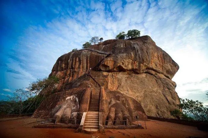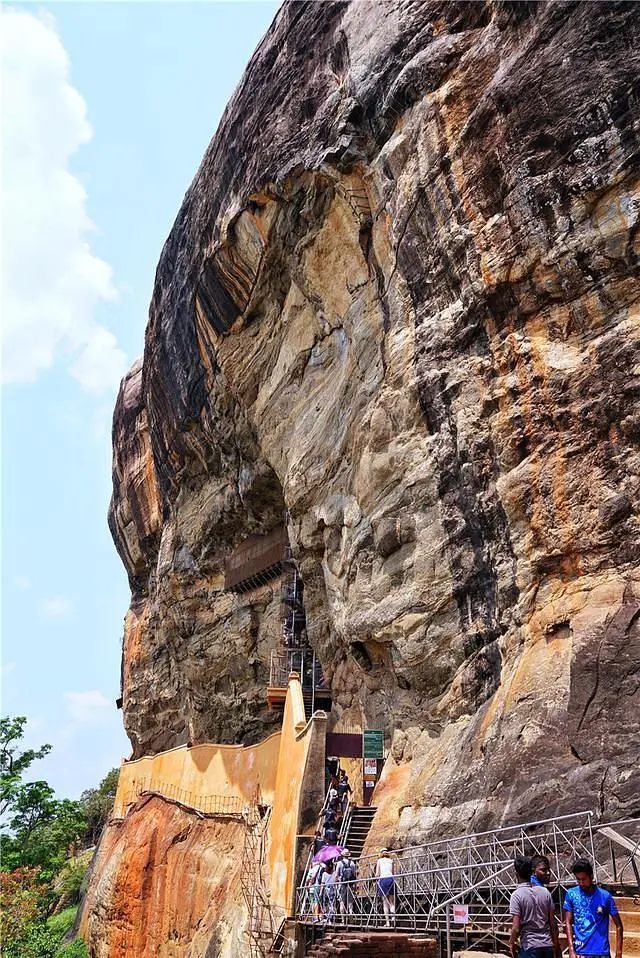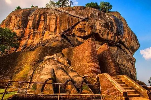 位于斯里兰卡中部锡吉里耶峰上,距首都科伦坡约160公里,是斯里兰卡著名古城堡遗址。锡吉里耶山峰平地突起,海拔349米,远眺顶峰,恰似葱绿的山林簇拥起一块巨石。公元5世纪,斯里兰卡孔雀王朝的迦叶波王子弑父篡位后,惧怕逃亡印度的弟弟目犍连回来复仇,离开了首都阿努拉达普拉,迁到锡吉里耶峰上,立王宫,建帝都。迦叶波国王为了把这座山峰建成固若金汤的辉煌王宫,费尽心机。但是18年后,他还是战死在目犍连手下。此后锡吉里耶古宫被遗弃了,直到1894年才被欧洲的一位考古学家重新发现。1948年斯里兰卡独立以后,政府拨款修建了登山游览的道路,向国内外开放。当年的锡吉里耶古宫,在方圆不过数英亩的峰顶上,宫殿凌空独立,似一头庞大的卧狮,故又有“狮子岩”之称。宫中有清凉殿,引流泉过地板之下以清暑;有王后御花园;有说法崖,设层层平台,供僧人说法用,崖周围有100座小壁龛环绕。宫中壁画数百幅,绘有迦叶波一世的嫔妃、天女等、飞天散花,形态绝美。在锡吉里耶山腰上用砖石砌了一只巨大的狮子坐像,作镇妖之用,今只剩两只一两米左右大小的前爪。从山脚到山腰建造了一条漫长的走廊,山腰西面环山长廊直通绘有彩色壁画的石壁。为了保护珍贵的壁画和游客的安全,政府还特制了一个巨大的铁丝网,罩在石壁上面。据说1500多年前,涂有石灰浆的石壁上曾绘有数百帧天女画像,由于沧桑巨变,现仅剩下21帧了。壁画上的天女们上身裸露,肤色金黄,陪衬着闪光的头饰,有的手执花盘和花朵,有的正在散花。这些壁画虽已历经千余年,但其色彩仍鲜丽如初。天女画像两边的石壁上,保留着一些粗刻文字诗歌,总数达685首,出于古代斯里兰卡国王、将军、僧侣、文人和信徒之手,是研究公元5世纪前后斯里兰卡社会、文化和宗教的珍贵资料。 在山腰平台上,仰望通向顶峰的阶梯,令人不寒而栗,一排陡峭的石梯始于一只端坐的仅剩半身的石狮子,石梯之上恰似龟背般滑溜的巨大石上,固定了一条铁链。游客们手握铁链一步一步地向险峻的山顶攀登。山顶的王宫早已夷为平地,仅剩下一片倒塌的庙堂、干枯的水池和荒芜的花园了。