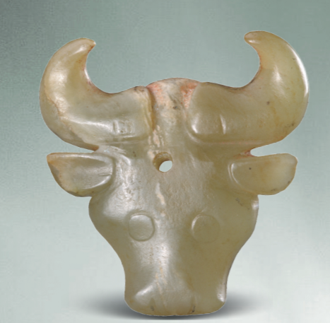 是1980年宝鸡鱼国墓地竹园沟9号墓出土。青绿色玉质,玉质细腻温润。圆雕,牛角粗壮向内弯曲,宽额,圆目,尖耳外张,嘴鼻宽大,脸颊凹陷。额部中央及牛的下颌部各有一穿,应是穿系用的孔。整件器物用料讲究,工艺精致写实,是西周早期玉器中的一件精品。