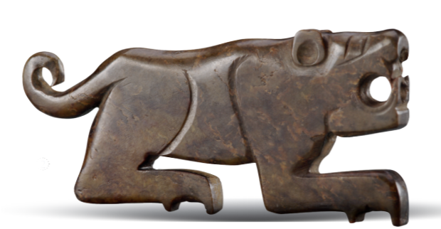 1974年宝鸡鱼国墓地茹家庄1号墓出土。青绿色玉质,受沁呈褐色。虎呈伏卧状,张口露齿,菱形目,小圆耳直立,四肢前屈伏地,长尾上卷。雕琢精美,神态传神,看似静卧的虎,但向上曲卷的尾巴给它增添了几分活力,猫科动物的灵动性一览无遗。