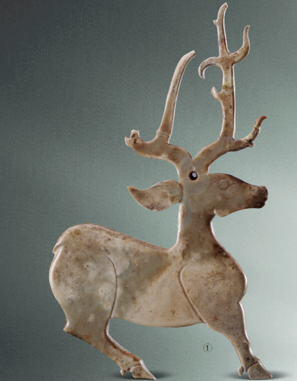 1974年宝鸡鱼国墓地茹家庄1号墓出土。这件玉鹿雕琢精美,表现的是一只急速奔跑中的小鹿在受到惊吓后,奔跑的动作戛然而止的瞬间。鹿的雕琢注意把握细节的刻划,比如肢体的雕琢,仅用两条阴刻线就表现出了鹿健硕的肌肉;又如用先琢眼眶后琢眼珠的方法,传神地再现鹿受惊的眼神,充分体现了鹿的形体之美及设计者细致的观察力和卓越的制作技艺。