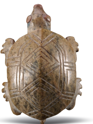 1980年宝鸡鱼国墓地竹园沟4号墓出土。青绿色玉质,整器白化,有朱砂附着物。玉龟头向前伸,凸吻微张,圆目鼓起,四肢作爬行状;龟背有中脊,阴刻出龟甲纹;龟腹光滑平整。玉龟造型写实生动,活泼可爱,工艺精巧,在鱼国墓地出土玉器中格外引人注目。