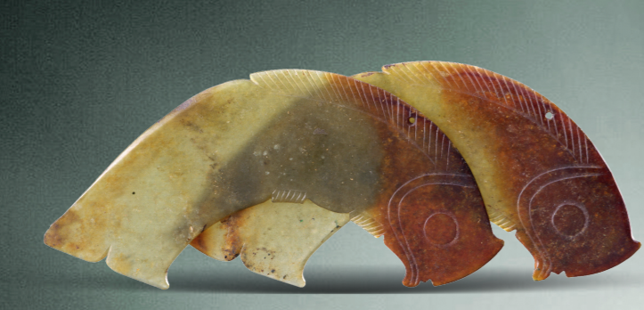 1974年宝鸡 国墓地茹家庄1号墓出土。玉鱼形体较大,为俏色片雕,玉质青绿色,晶莹通透,鱼首有褐色斑块。作跳跃状,丁头嘴微张,平行的短阴线刻划出 鱼的腹、背鳍;背鳍上有一小孔,应是穿系用的。这对玉鱼采用“对开成型”工艺制作而成,雕琢精细,形象生动,动感极强。