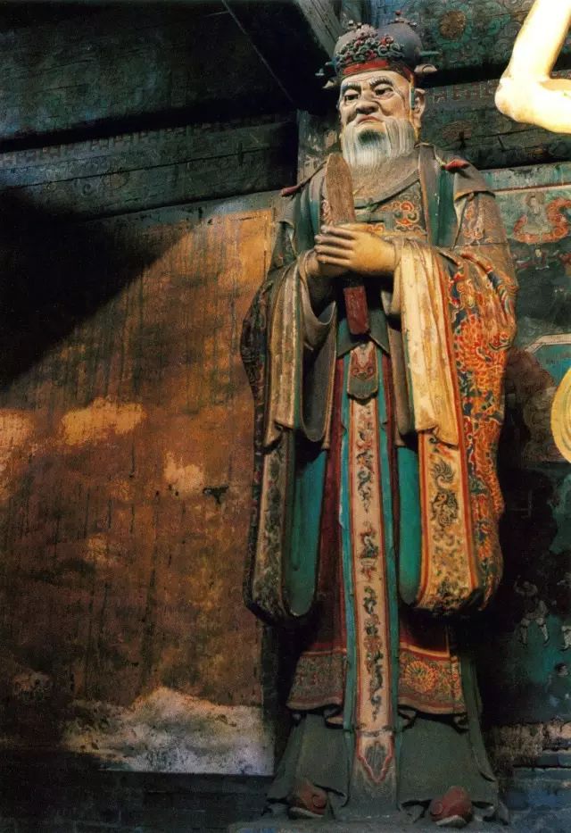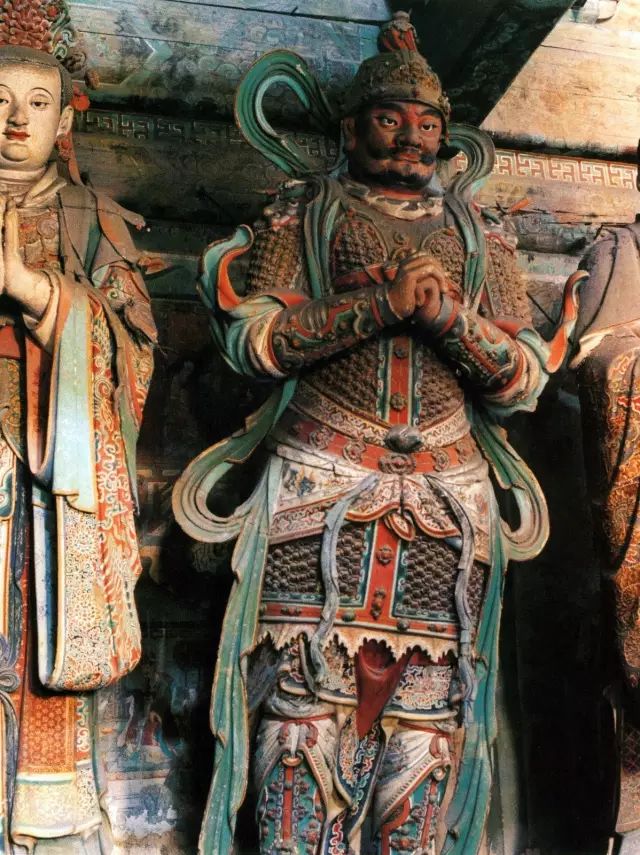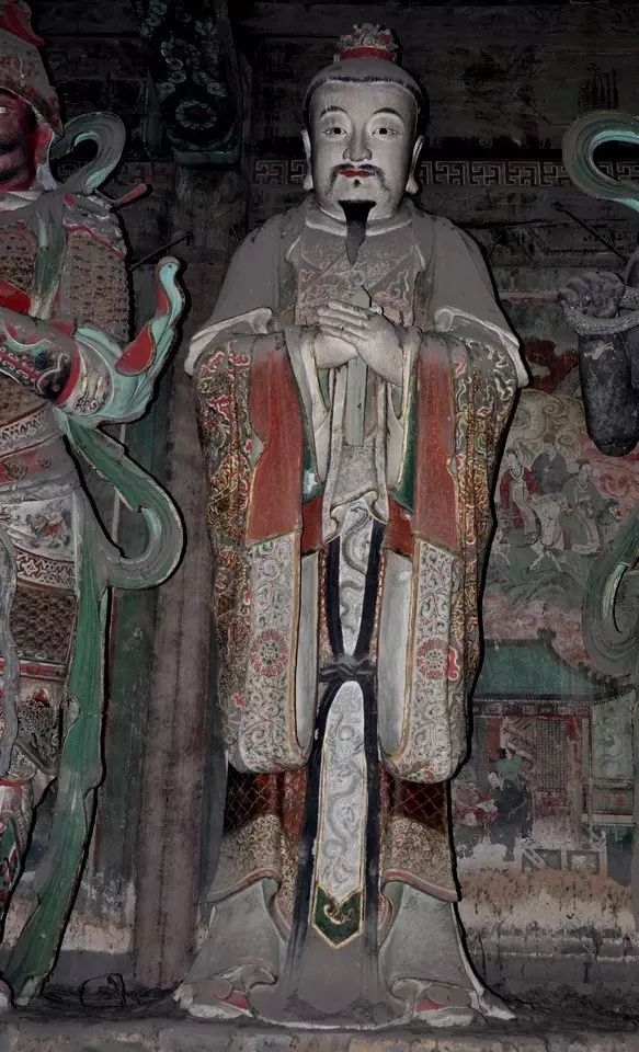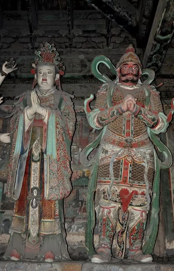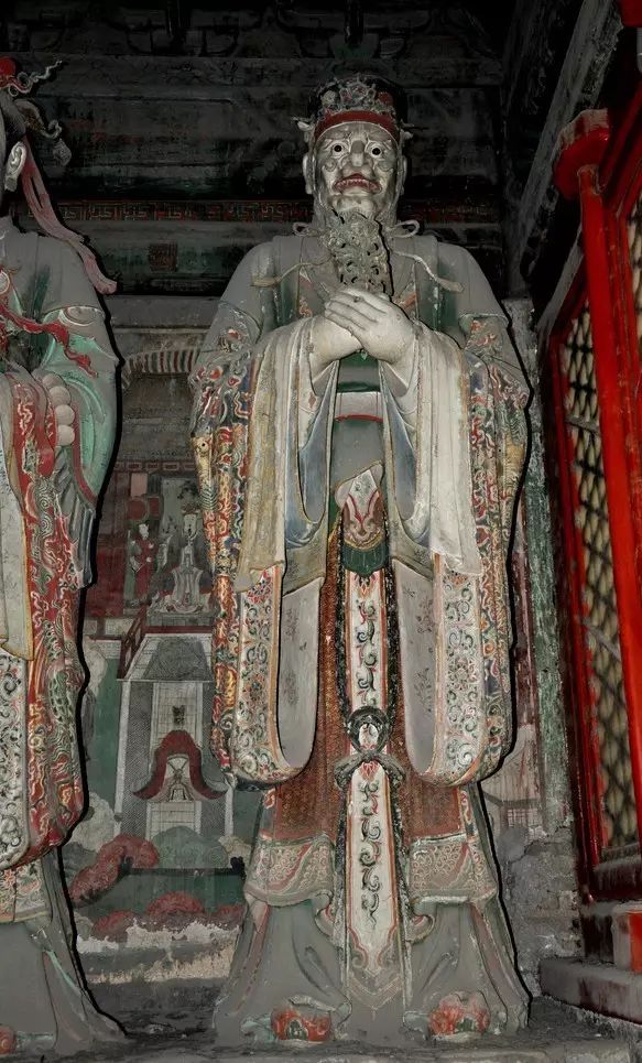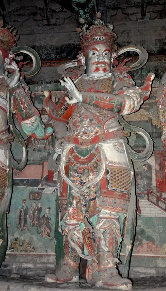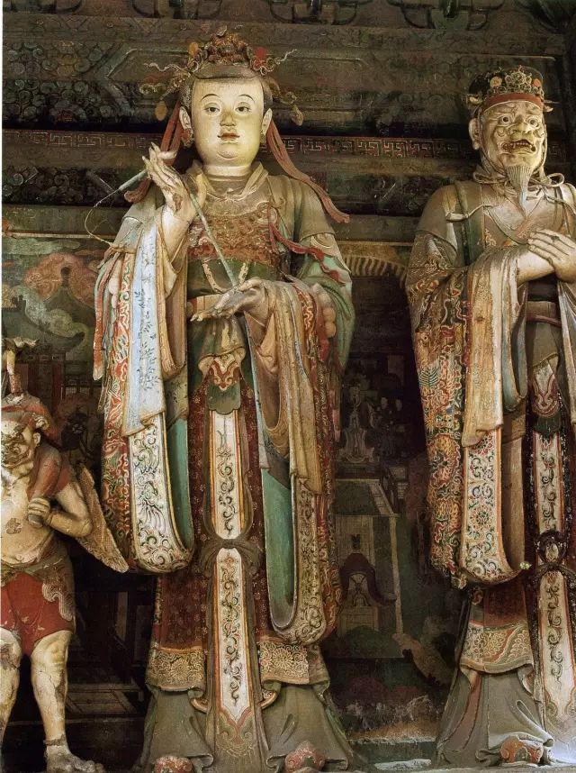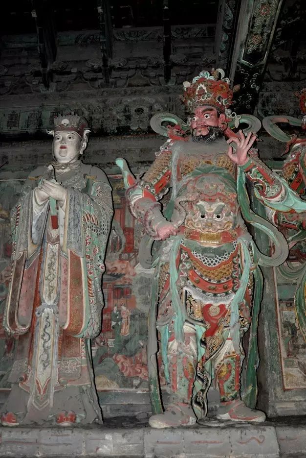 在初步认定28尊彩色塑像名号的过程中,发现其组合排列及群体布局的构成,构思周密。不仅如此,在那缜密的思考中还注入了宗教宣传的功利意图。比如,是将帝后、文官武将、容貌修好的世俗裙钗、面目狰狞的神话人物穿插排列,使一字排开的众多塑像个体,在形式感上有着动静、收放、文野于服饰华丽或简约的对比变化,一方面减弱了所有塑像都以端正严肃的站立姿势,平均排列在须弥座上,把可能产生的呆板、单调的排列变成为有节奏变化的构成。同时,又使一尊尊单体塑像在形式美感上有了内在联系,使众多高大塑像形成气势雄伟的群像阵容。而且还具有另外一种特征即精湛的彩绘。“塑容绘质”是中国传统雕塑的一大特色,无论是石刻造像还是泥塑造像,最后往往以着彩形式完成,彩绘在增强雕塑作品的表现力方面发挥了其他不可代替的作用。28尊彩色塑像的色彩、装銮浓重,以朱砂、黄丹、雄黄等矿物质原料为主,大量参用赤金、白银,形成富丽辉煌、金彩璀璨的艺术效果。另外,“开脸”的成功不可低估,28尊彩色塑像尊尊个性鲜明的性格和生动丰富的表情,在很大程度上是通过面部形象充分揭示的。形态生动逼真,充分显示了明代彩塑的艺术魅力。
