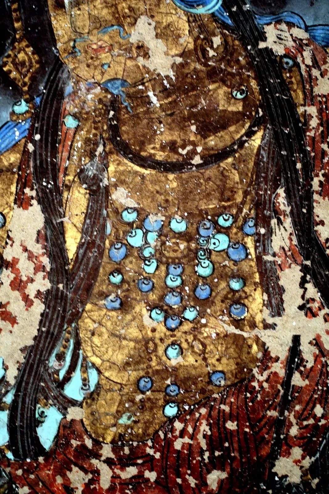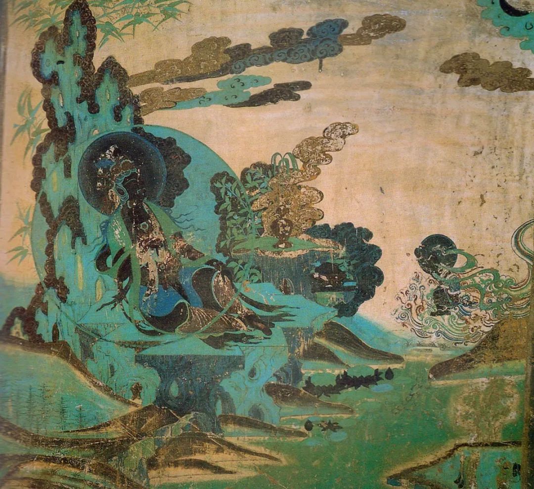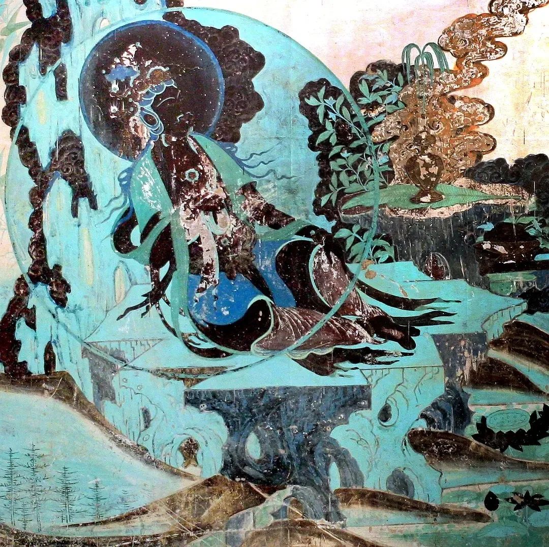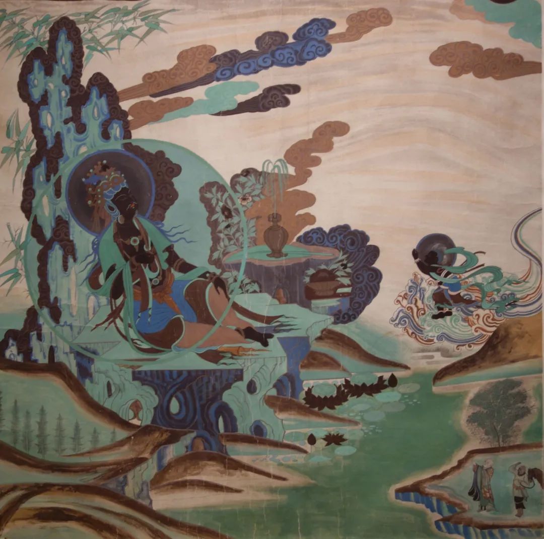 这幅西夏时期水月观音十分经典:画面上南海茫茫,景色寥廓,整个画面以石绿、墨绿为主体色彩,颜料据说是用蓝、绿宝石研制而成,历经千年而颜色不改,且随着时间流逝而愈发鲜艳。线条流畅,人物情态逼真。