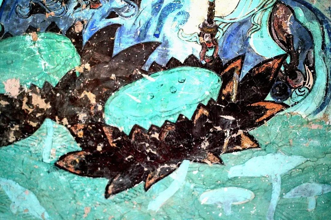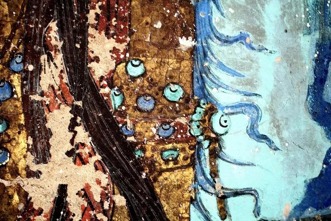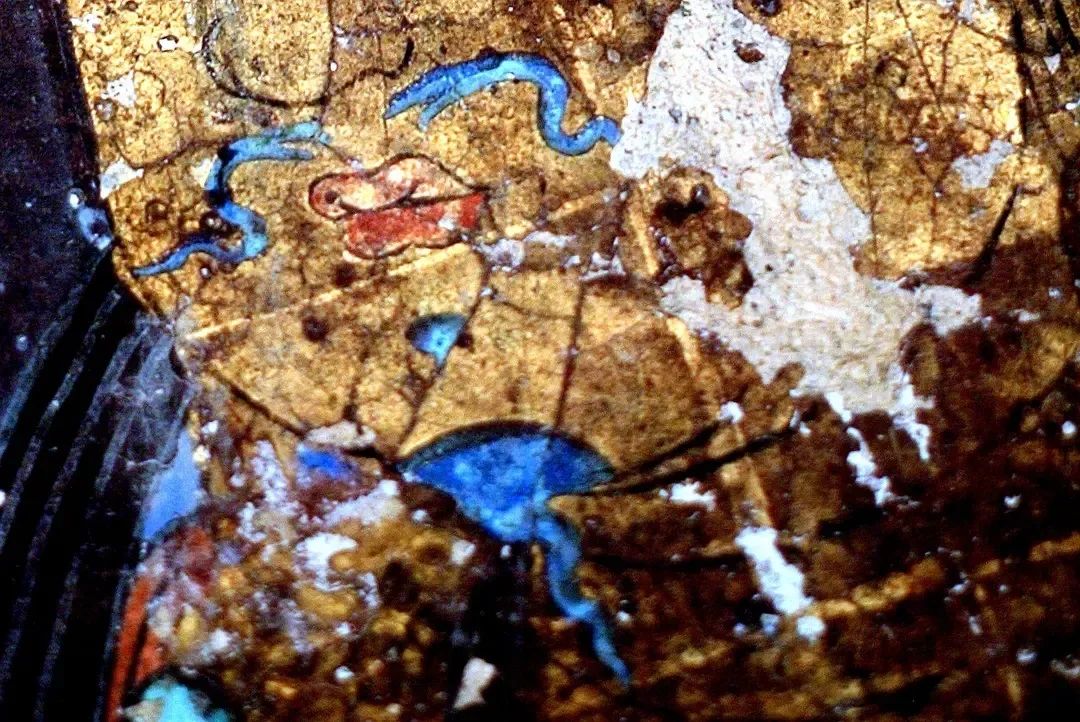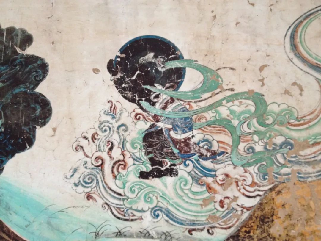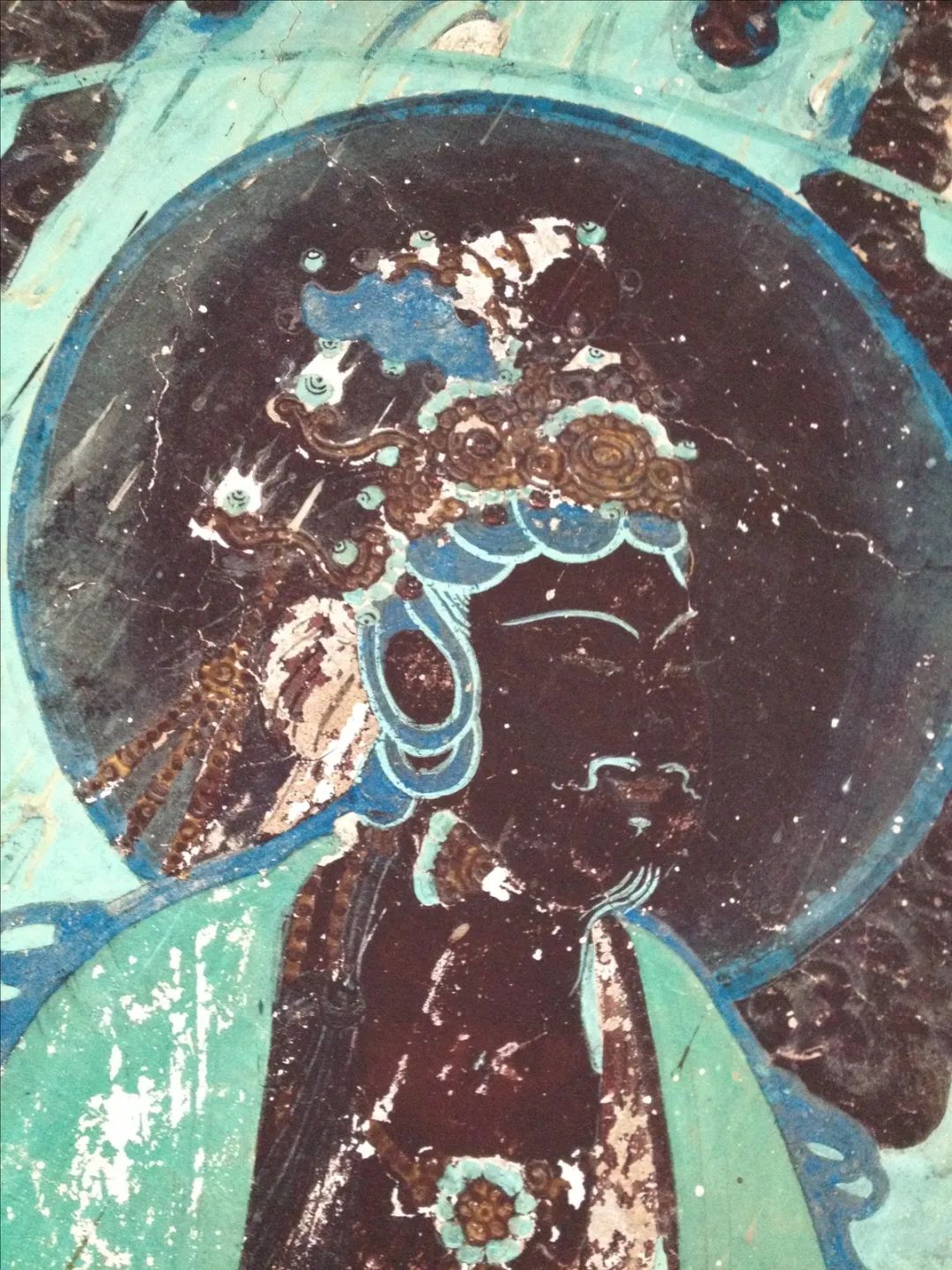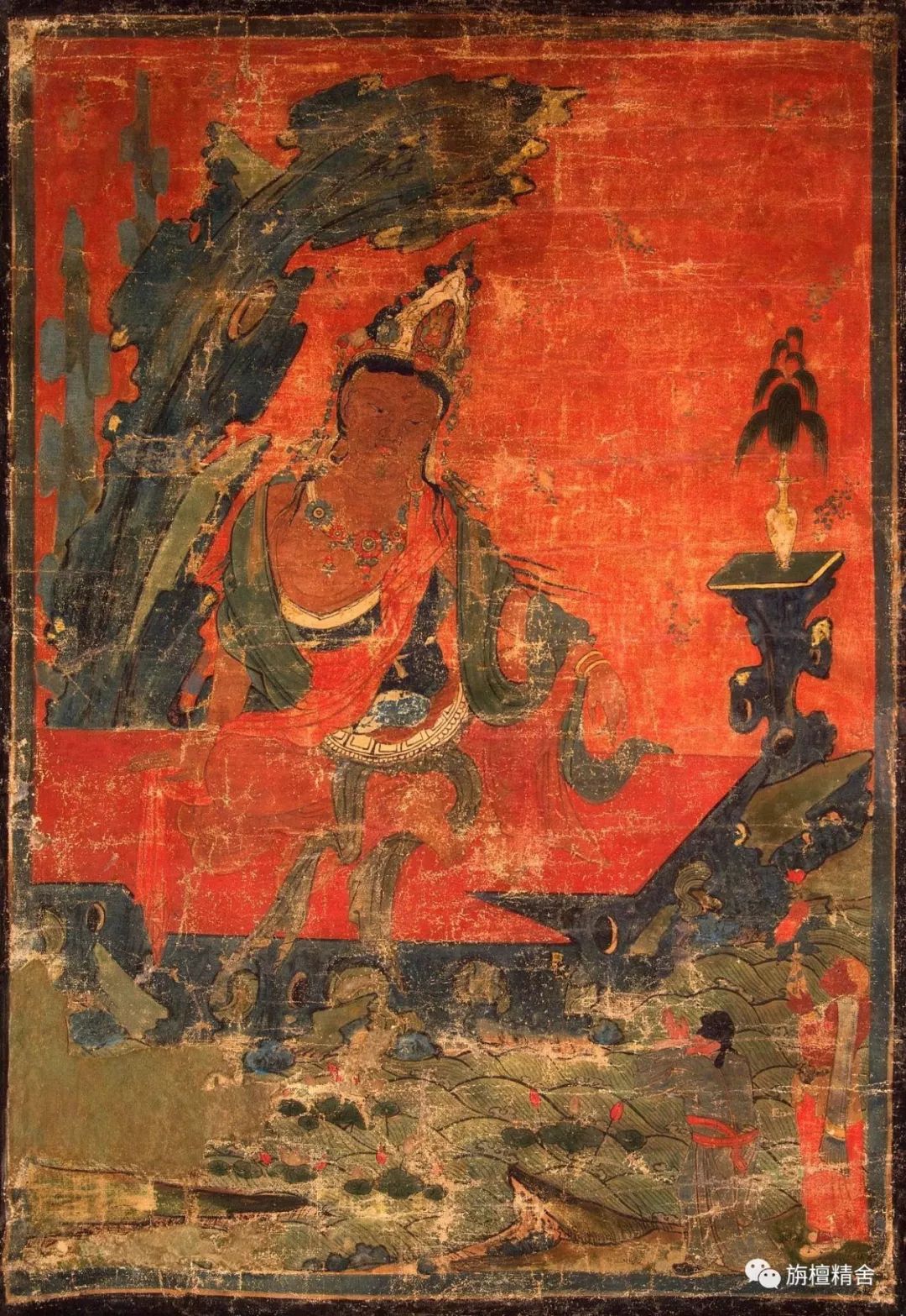 这幅西夏时期水月观音十分经典:画面上南海茫茫,景色寥廓,整个画面以石绿、墨绿为主体色彩,颜料据说是用蓝、绿宝石研制而成,历经千年而颜色不改,且随着时间流逝而愈发鲜艳。线条流畅,人物情态逼真。
