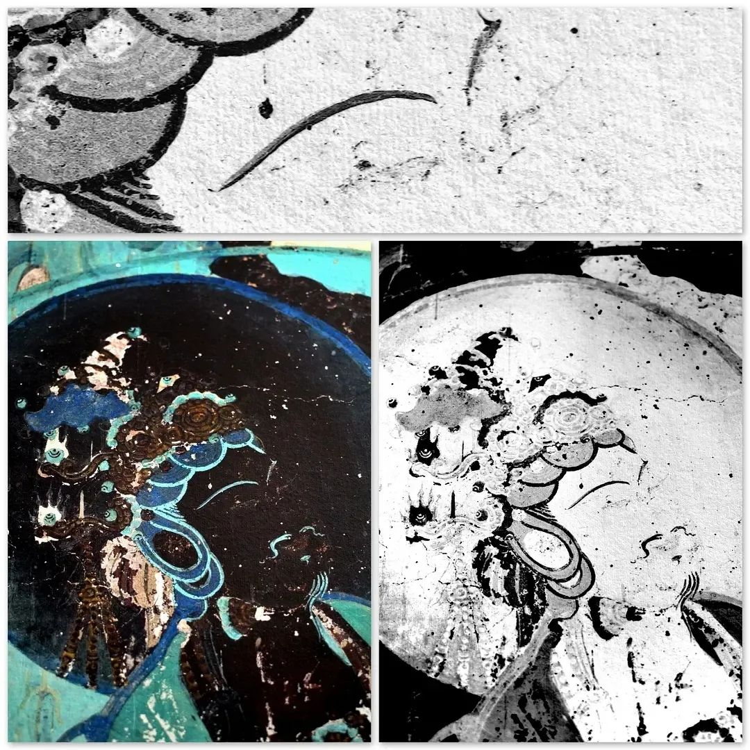 “环璎戴珞的观音如高士般背倚青山翠竹,意态萧散的望向天际一轮残月,一手微举在胸前,一手扶膝,带了点漫不经心。闲云出岫,月儿卧在云端,有飞天行经,遥相礼拜,还有僧人弟子在右下方平台上向他合十致礼,可周遭的一切似乎都与观音毫无干系,不能扰他分毫,他依旧是心无挂碍的微仰着头看向月亮。他与高卧远端远离尘嚣的月亮无异。这整幅图都情致动人,令人不自觉的屏息静气,又满怀神往。”