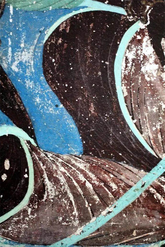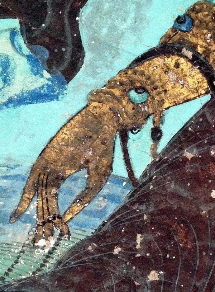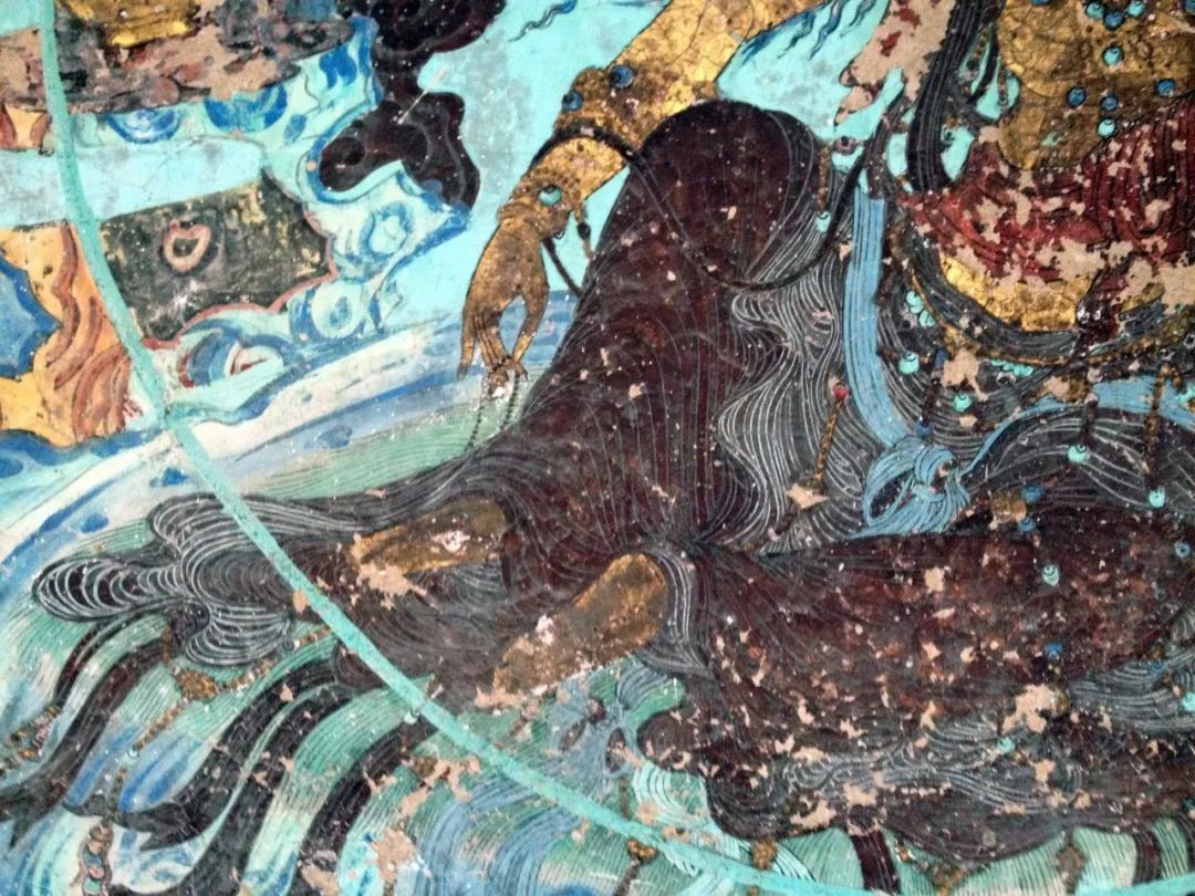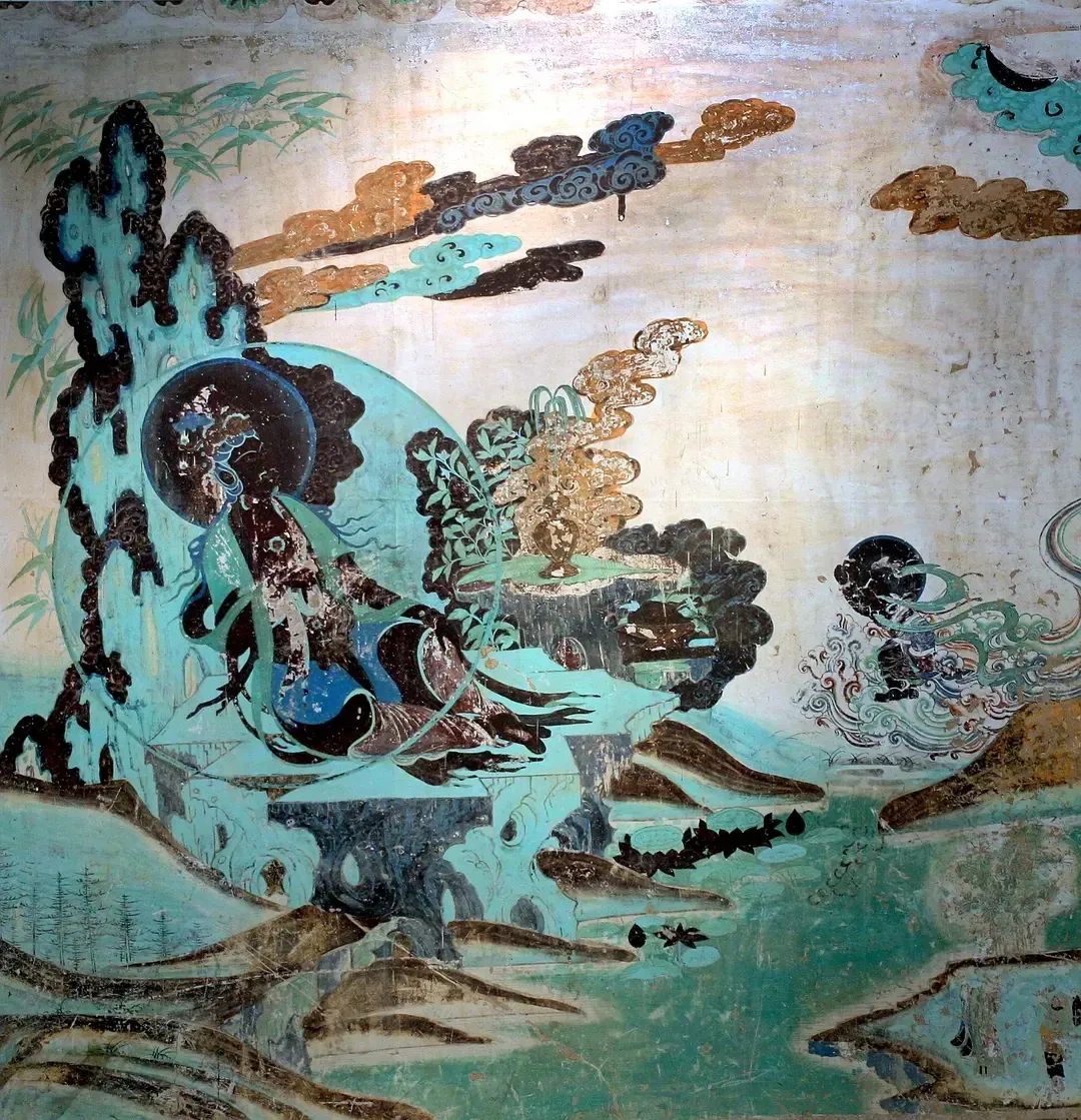 这幅西夏时期水月观音十分经典:画面上南海茫茫,景色寥廓,整个画面以石绿、墨绿为主体色彩,颜料据说是用蓝、绿宝石研制而成,历经千年而颜色不改,且随着时间流逝而愈发鲜艳。线条流畅,人物情态逼真。