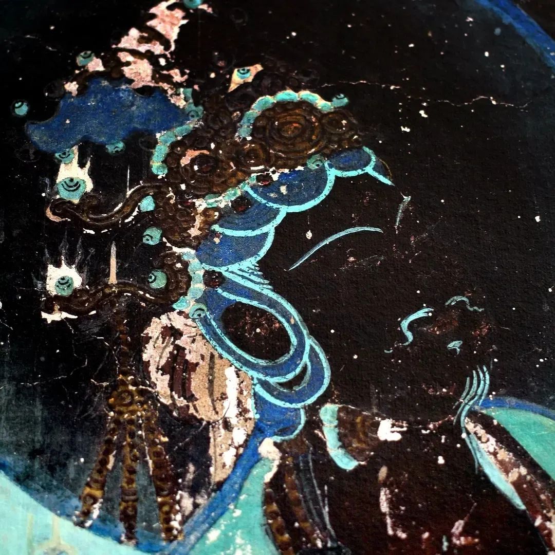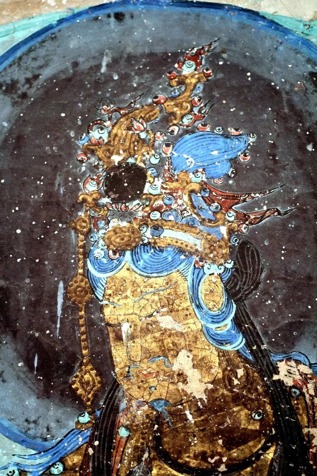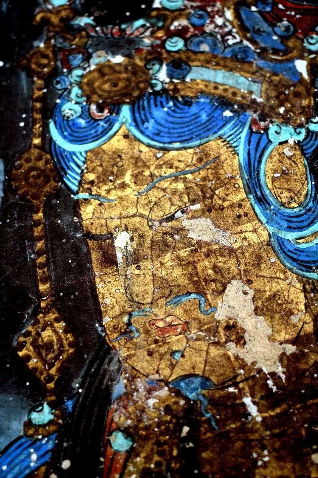 菩萨长着男性才有的蝌蚪胡须,胸前挂有璎珞,画面上金色、宝蓝交织,金碧辉煌。