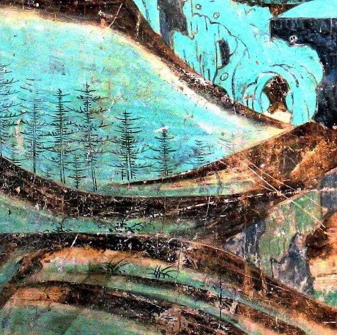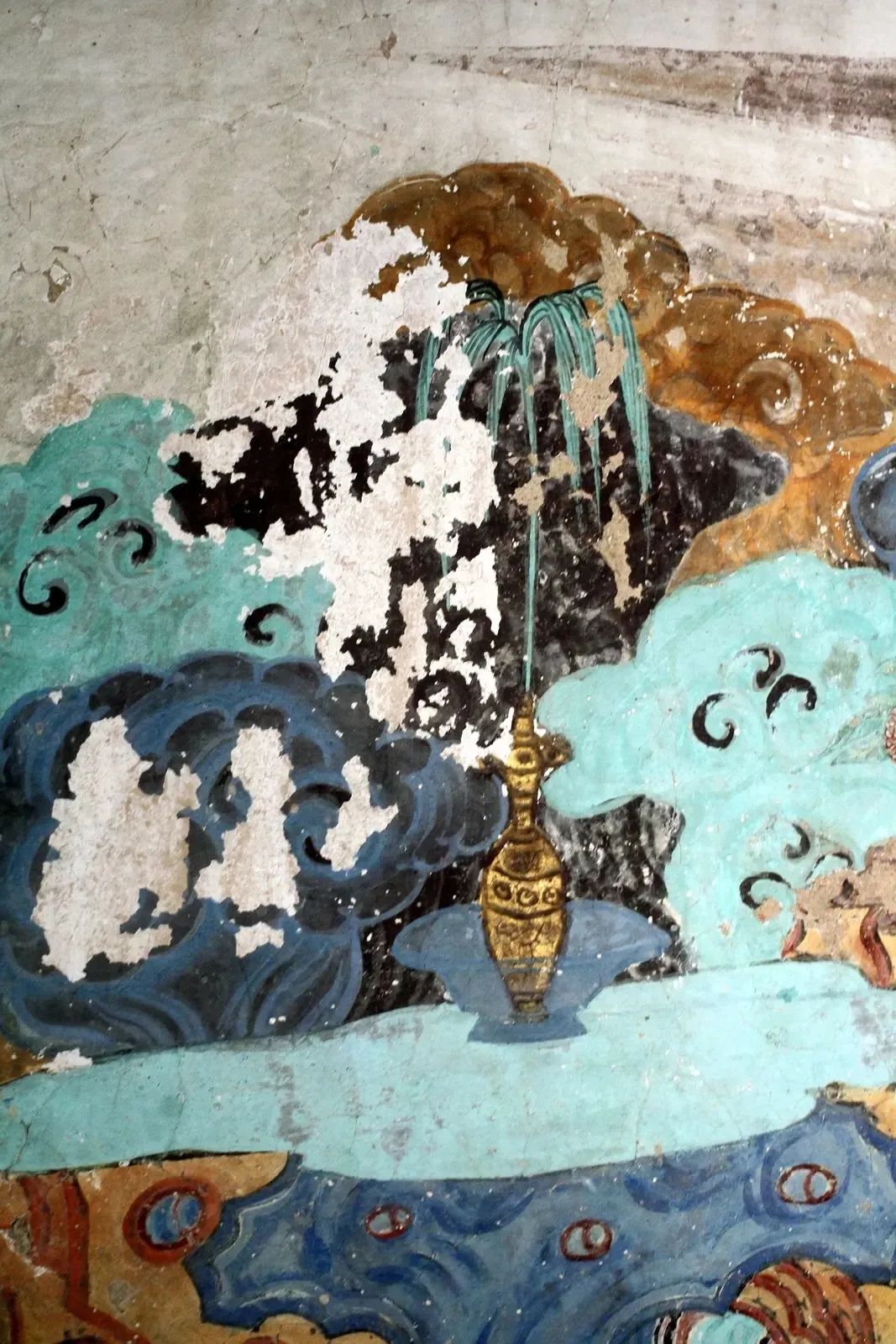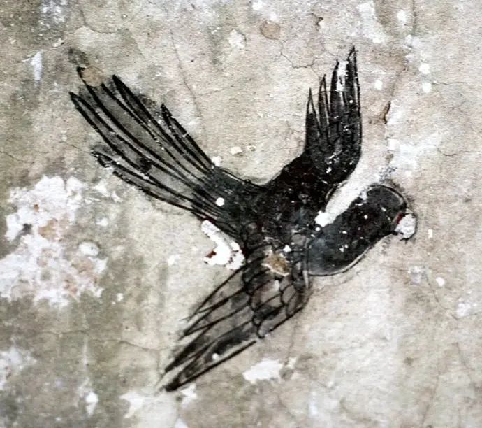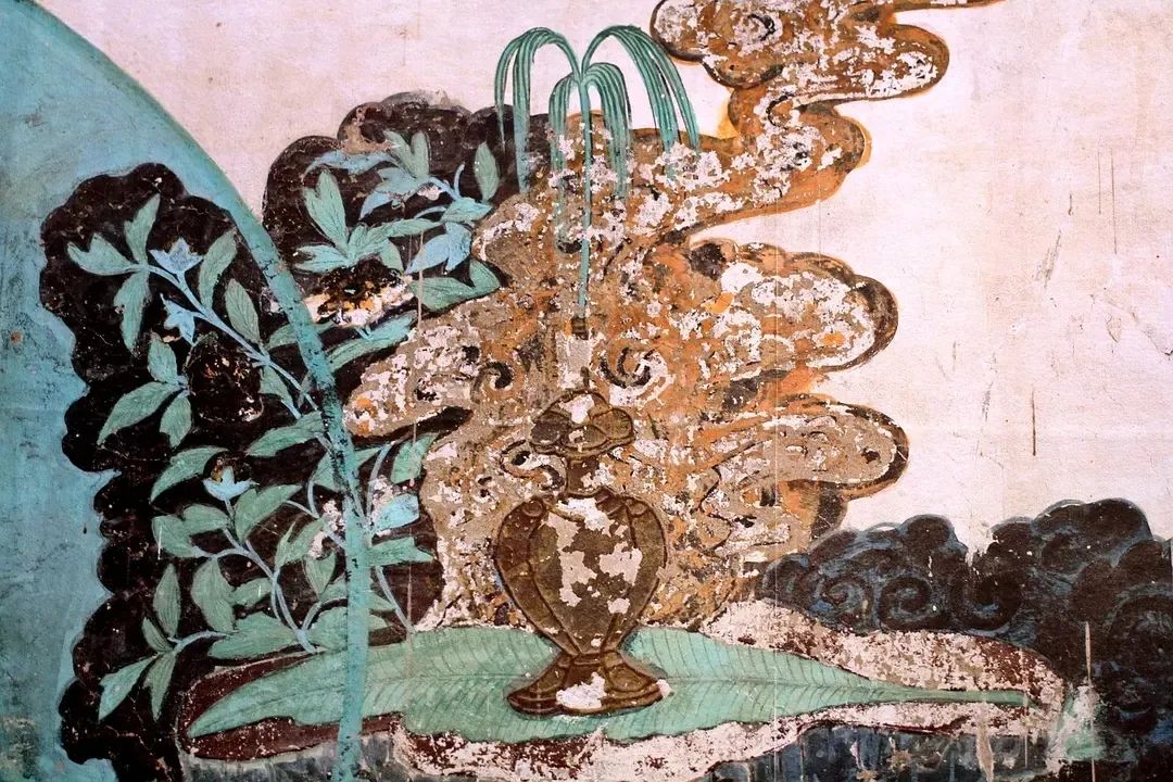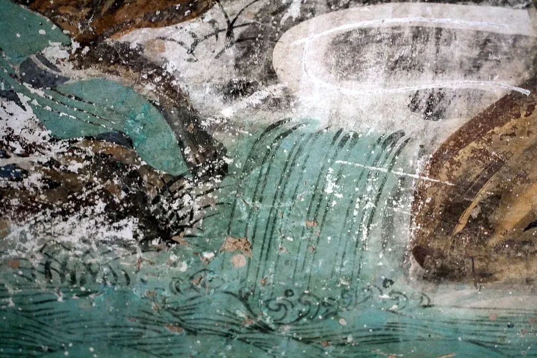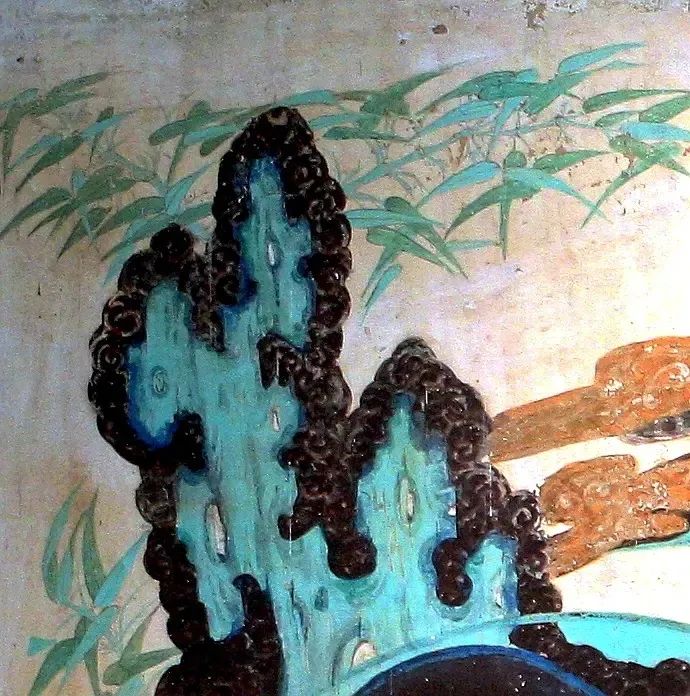 方形的画面构图中,以对角线为分界线,下部表现观音、善财童子、岩石、大海、修竹,上部则只有一绺彤云点缀,画面有大部分是空白的天空。这种对角线构图,虚实对比,大量留白的手法,源于南宋山水画的流行风格,正是画史上所谓“马一角、夏半边”(马远常在画面中只画一角,大部分留白,夏圭的山水画也常常只画半边,而有半边留白)的特征。壁画中的这种构图,在有限的壁面上拓展了画面无穷无尽的空间,给观者留下了回味无穷的想象世界。