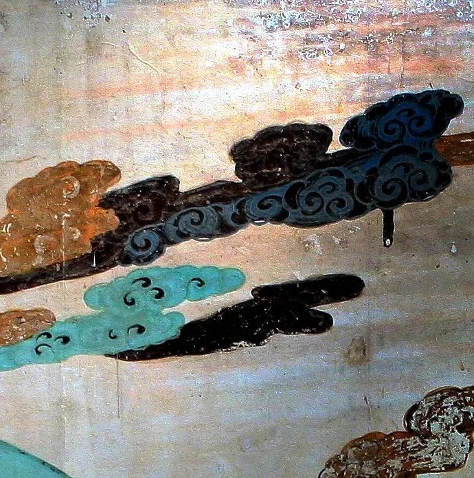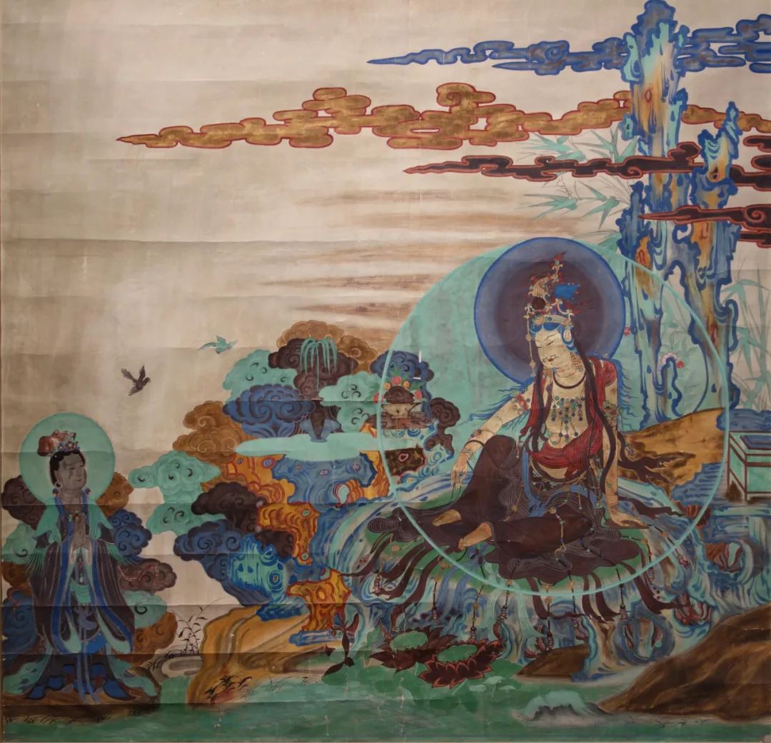 在色调上,以青绿色调为主。又在观音的面部身体部位以贴金,对比天空部分的彩云,更显得金碧辉煌。现在帖金部分已经氧化变黑,但仍可以感受到清新淡雅、宁静悠远的意境。
