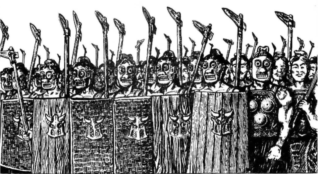 无独有偶,《山海经》也记载了一个神秘国度——“鬼国”,可能指的就是“鬼方”。鬼国之人,威姓,乃是少昊的子孙,只以一只眼睛示人,经中还说道这只眼睛长在面部的中央,因此鬼国又被称作一目国。去除怪力乱神的成分,真实的鬼方人应该是用头盔或者面具将自己的脸遮盖,只留一个小孔用以观察,如此打扮可以起到惊骇敌人的作用。