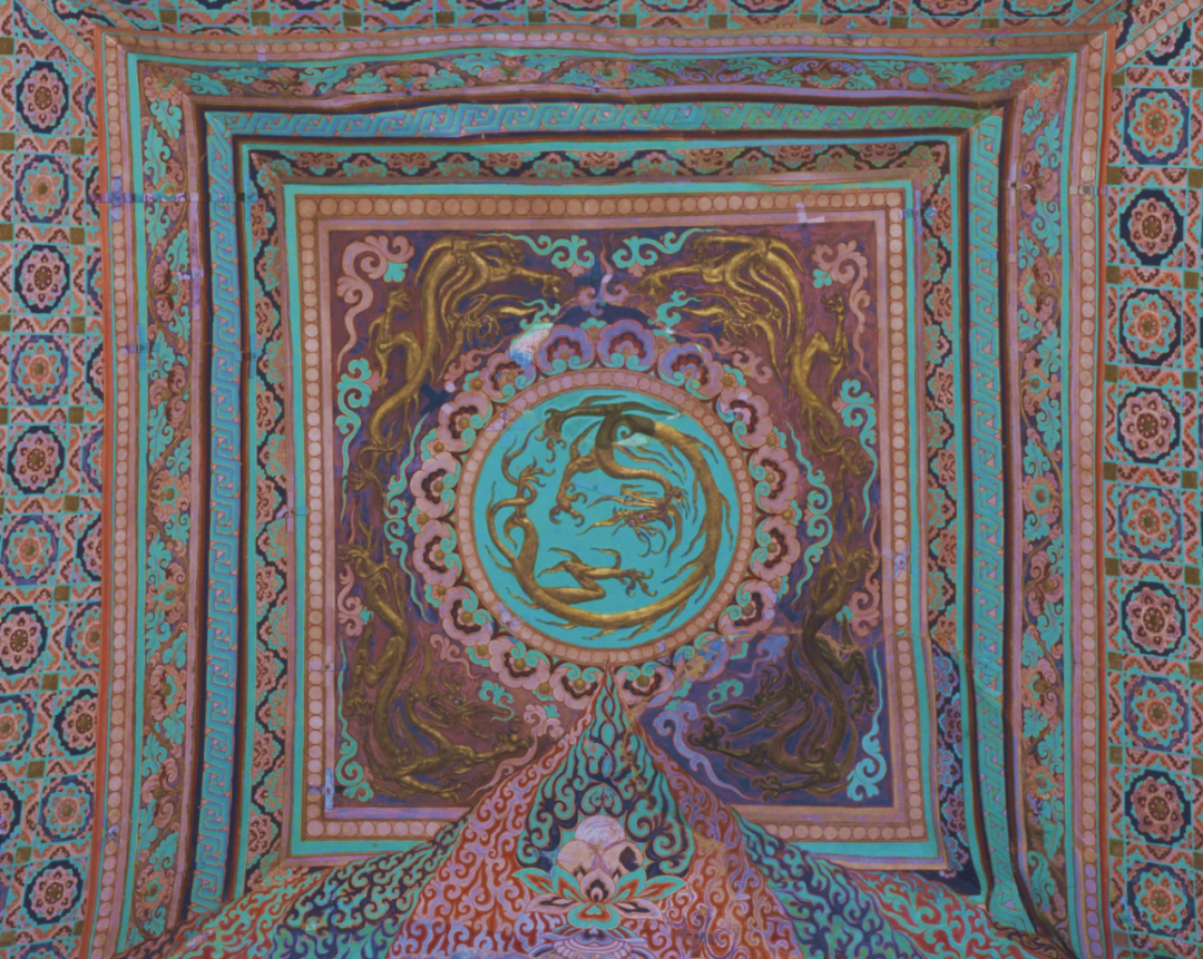 云游的蟠龙使整个藻井产生了飞速运动的动感,周围配合团花纹及彩云图案,产生华丽庄严的效果。