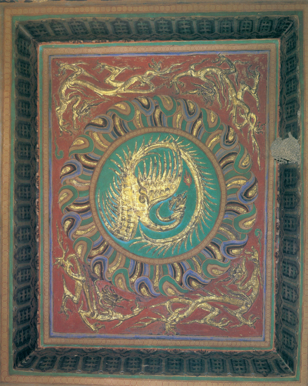 西夏时重绘的团凤四龙藻井,中心浮塑一只金凤凰,凤凰展开双翅,做飞翔状,凤尾特长,接翅膀盘卷为圆形,有旋转之势,凤头欲衔一颗火焰宝珠,绿底金凤,组成圆心;外围七彩卷瓣轮形大莲花;莲花中心的凤凰和莲花四周的蛟龙都向同一个方向飞翔、旋转,生动自然,使藻井井心具有鲜明的旋动感。