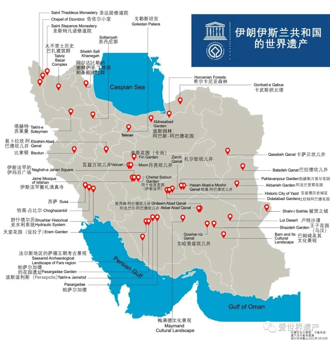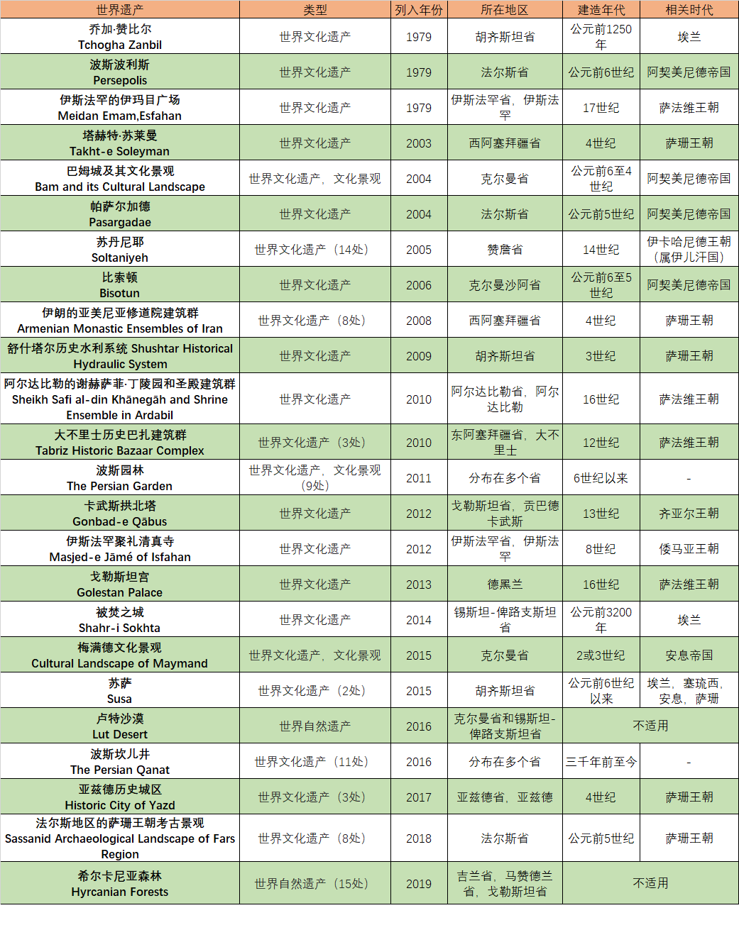 伊朗是西亚的文明古国,拥有悠久而厚重的历史和光辉灿烂的文物古迹。截至目前,伊朗共有世界遗产24项,其中世界文化遗产22项,世界自然遗产2项,与美国数量一样多在全球国家中位列第十,是名副其实的遗产大国。这些遗产地在世界范围内也有着举足轻重的地位。现将伊朗的世界遗产介绍如下: