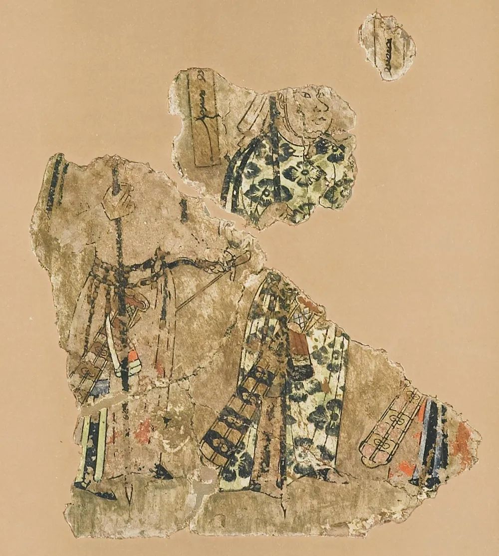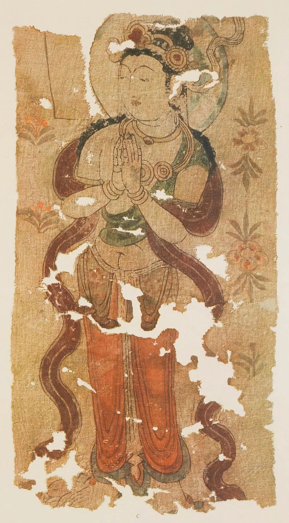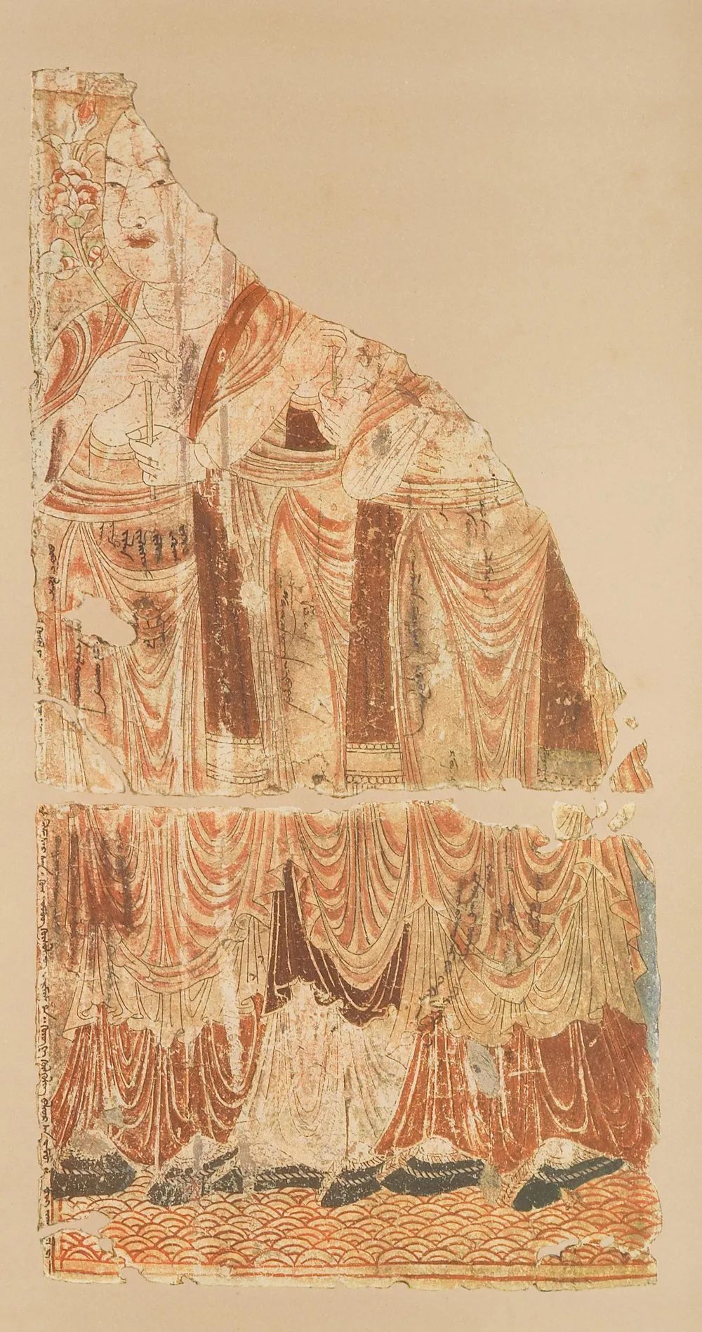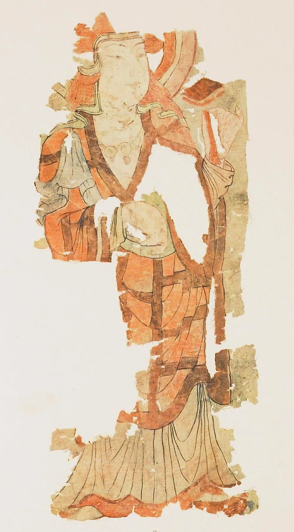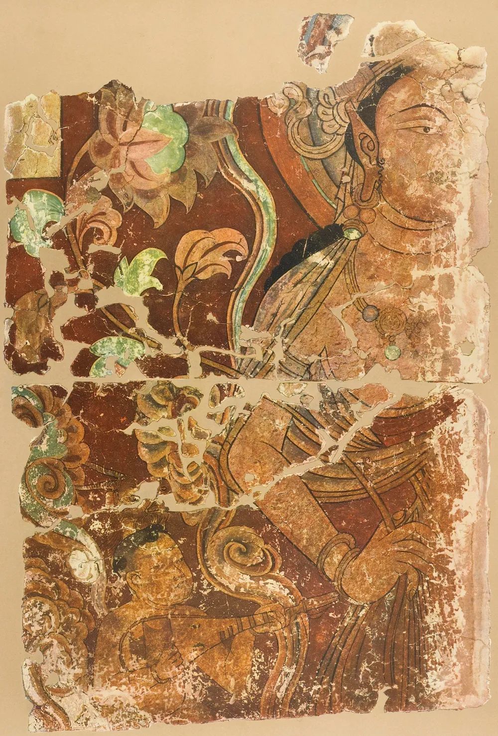 二战结束以后,德国在美苏大国意志的主宰下,被分裂成了东西两部分。由于原柏林民俗学博物馆为防止馆藏吐鲁番文献文物被毁于战火,将文物转移多处分藏,所以,除了战火毁坏和苏联拿去的部分以外,二战后,文物也被分藏在了东西德。就这样东藏西藏,德国的西域文物究竟流失了多少,毁坏了多少,目前还留存多少,一切都成为历史之谜,就是这幅飞天壁画现在是否存在或收藏在哪里也不得而知,我们仅能从德国阿尔伯特·冯·勒柯于1926年出版的《中亚佛教古代后期》第五卷插图中以饱眼福,实在令人扼腕叹息。
