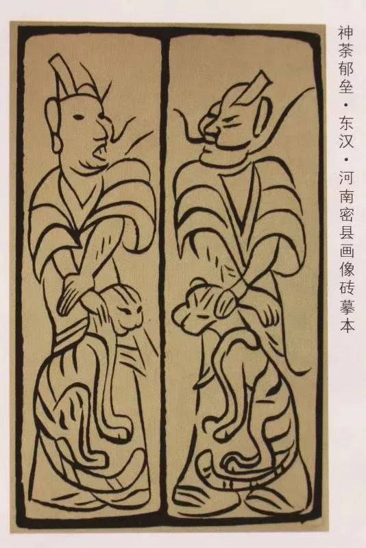 汉代王充在《论衡·订鬼》中引《山海经》有记:“沧海之中,有度朔之山,上有大桃木,其屈蟠三千里,其枝间东北曰鬼门,万鬼所出入也。上有二神人,一曰神荼,一曰郁垒,主阅领万鬼。恶害之鬼,执以苇索,而以食虎。于是黄帝乃作礼,以时驱之。立大桃人,门户画种荼、郁垒与虎,悬苇索以御凶。[17]”