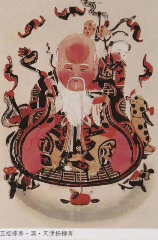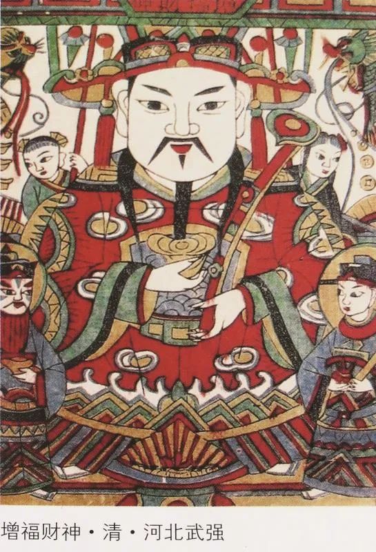 健康长寿是人们亘古不变的追求。因松柏常青,龟鹤长寿,故人们常以松柏龟鹤形象来表达对于长寿的祈愿。而随着道教的盛行,南极仙翁也逐渐成为了人们祈求长寿安康的对象。结合两者,所以,门神中出现了“寿星佬”的形象,背景多为龟鹤松柏,而寿星佬的手中多还要有一枚吃了即可长生不老的蟠桃。通过对龟鹤、松柏、寿星和蟠桃的描绘,人们希望可以借助祈福门神的力量,将健康与长寿带给自己,达成自己的心愿。财富同样如此。作为人最为普遍的追求,掌管财富的财神赵公元帅应运而生,成功晋升为门神。而在赵元帅之后,“招财童子”、“利市仙官”、“戏蟾刘海”等一系列招财进宝形象的出现,更是满足了人渴求财富的欲望,纷纷成为了受人喜爱的祈福门神。以上两例算是文门神形象中最为常见和基础的,因为现在这一类门神大多还被人津津乐道,而且极为通俗易懂,所以其他例如“送子娘娘”、“赐福天官”等等的祈福形象这里就不一一论述了。