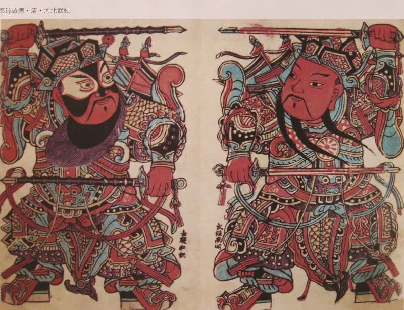 传为宋元作品的《三教源流搜神大全·卷七》中有关于“门神二将军”的记载:“按传:唐太宗不豫,寝门外抛砖弄瓦,鬼魅号呼,六院三宫,夜无宁刻。太宗惧之,以告群臣。叔宝奏曰:‘臣平生杀人如摧枯,积尸如聚蚁,何惧小鬼乎?愿同敬德戎装以伺’。太宗可其奏,夜果无警,太宗嘉之,谓二人守夜无眠,因命画工图二人之像,全装怒发,一如平时,悬于宫掖之左右门,邢祟以息,后世沿袭,遂永为门神云。[20]”通过这段文字可知,虽然秦琼与尉迟敬德没有实际的捉鬼行为或事迹,但通过唐太宗——地位显赫的皇帝,亦可以说是现世的神——的认可,二人的神性得以确定,成为继钟馗之后的又一对门神形象。