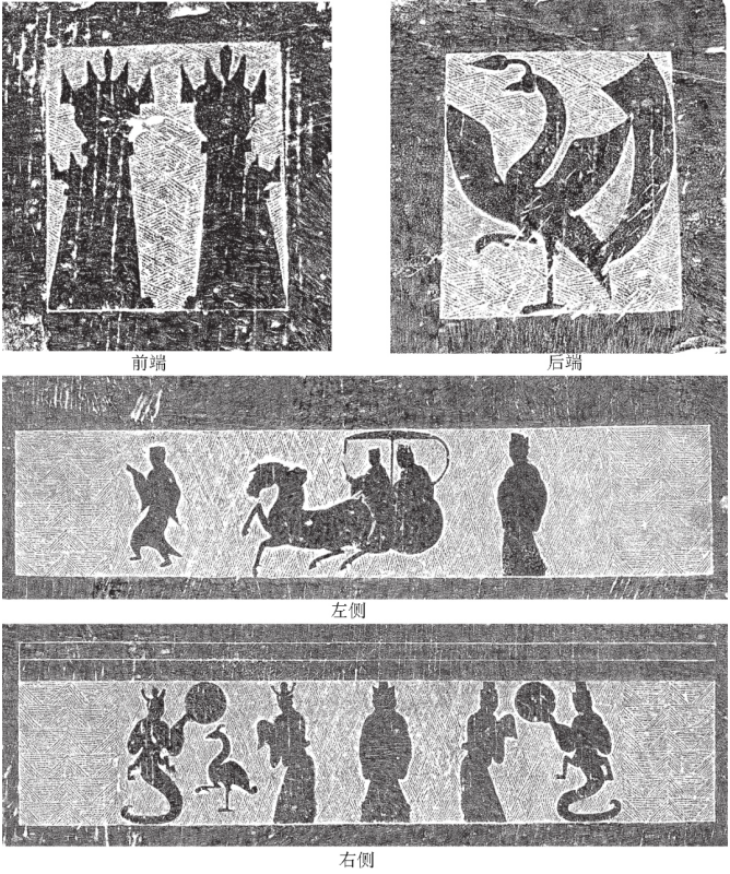 棺身四周均有画像。前端画像为子母双阙,左右对称分布;后端画像为凤鸟,呈曲颈单脚站立姿态。棺身左侧画像为车马出行图,由四个人物形象和一辆马车构成,其中马车上靠后的一人头戴进贤冠;棺身左侧画像应当是带有升仙意味的图案,左右两侧为人首蛇身的伏羲女娲,左二为单脚站立的凤鸟,剩下三个均为人物画像,左三和右二的人物形象分别向左右两侧站立躬身,中间一位人物形象则戴进贤冠,呈站立正视的姿态,由此推断中间这位人物画像应当与左侧画像中马车上戴进贤冠者为同一人,刻画的是本墓的墓主人形象。