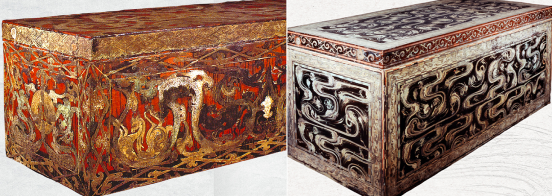 漆棺最早见于商代殷墟墓葬,在汉代又得到了发展。漆棺多见于楚地,以长沙马王堆汉墓出土的漆棺最为精美、典型。汉时的漆棺,在髹漆的同时,还会在木棺表面进行彩绘,湖南省博收藏的两件出自马王堆汉墓的彩绘漆棺便是在漆地上用彩色颜料绘出生动精美的神仙、瑞兽、怪兽等图案,组成一个个小情景,再由一个个小情景组成一幅展现仙境及仙界生活的大场景。