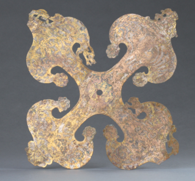 汉代重庆地区,除了画像石棺外,还流行着另一种独具特色的饰棺方式,即用铜打造成有特殊造型的铜片,并用泡钉将其固定于木棺上,这些特殊的铜片被称为铜棺饰。这些鎏金铜棺饰也是汉代随着墓葬形制的改变而产生的新型饰棺方式之一,它的出现也是顺应了时代的发展。