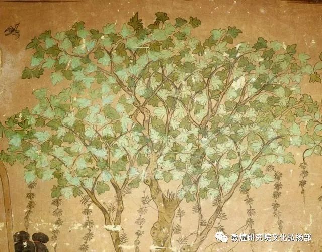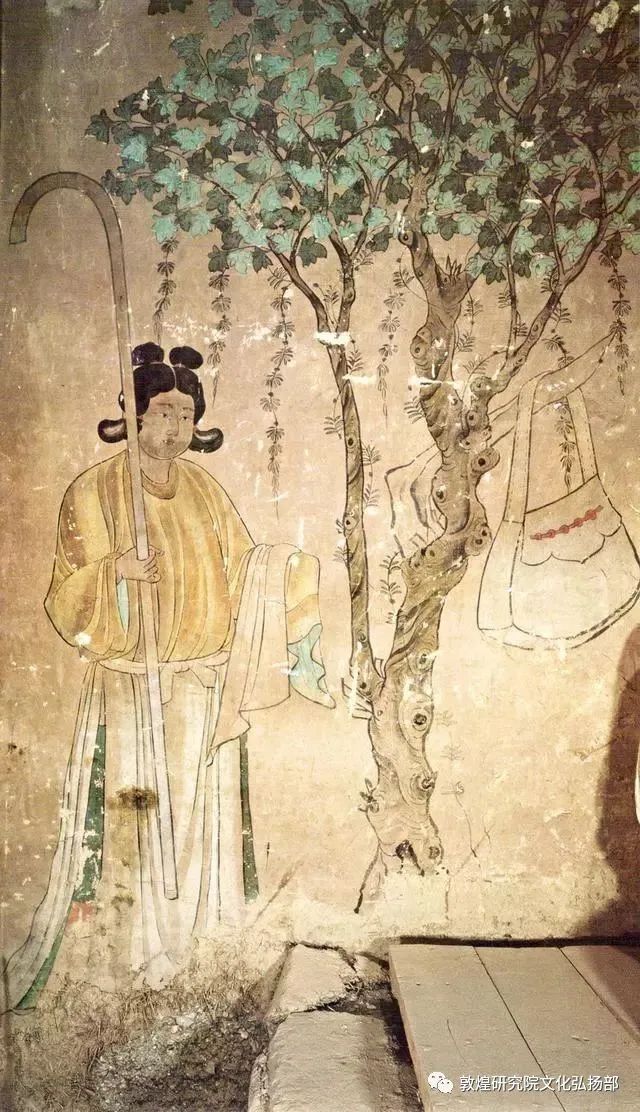 另一侧执扇的比丘尼,经历了近千余年的时光,俨然模糊了她的样貌,但她却恭敬的站立在圣树之下,挺拔的身姿映衬着苍劲多节的树干。圣树上藤萝缠绕,叶子茂密苍翠,富有无尽的生命力。