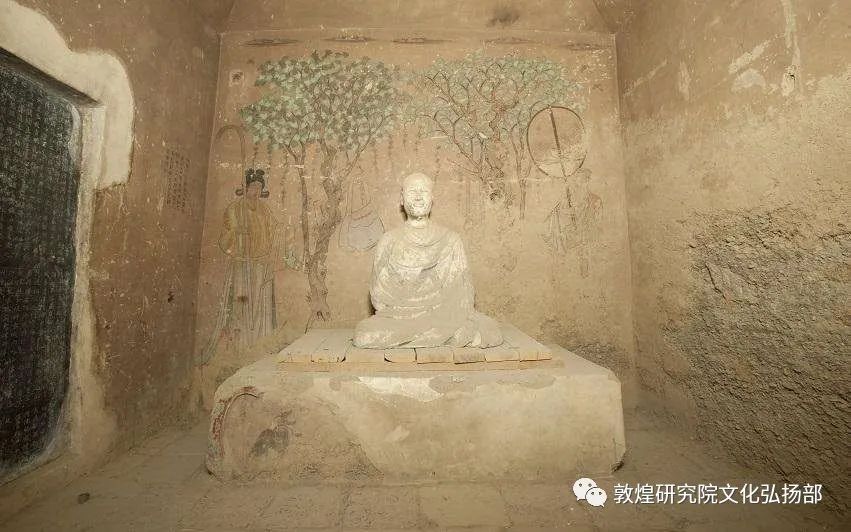 洪辩身为一代高僧、吐蕃时期都教授、归义军时期都僧统,在敦煌佛教界和世俗界均有重大影响,故而洞窟中还保存了洪辩高僧的真容塑像,放置在带有壸门的方台上,在其后部墙壁上还绘制有表示高僧日常生活的画面,近事女、比丘尼、圣树、水瓶、挎包等图像。